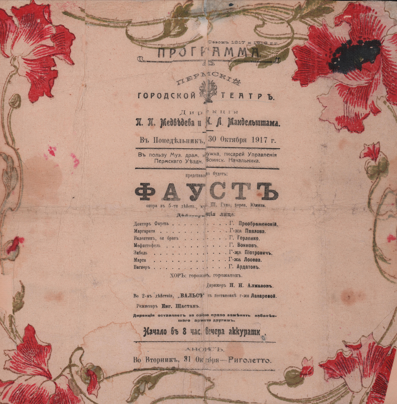 В целом публика хорошо принимала артистов и давала театральный сбор. Но в начале осеннего сезона 1917 года, в период социально-политического кризиса, неизбежно приближавшего революцию, в общественной жизни Перми тоже происходили перемены. Театральное искусство более не могло занимать приоритетное место в интеллектуальном и культурном быте пермяков. Но театр еще продолжал работу и остро нуждался в зрителях. Для привлечения зрителей в театр Медведев придумал весьма оригинальный и, как бы сейчас сказали, креативный способ. Он напечатал анонс спектакля «Фауст», который должен был состоятся 30 октября 1917 года, на ресторанной салфетке.