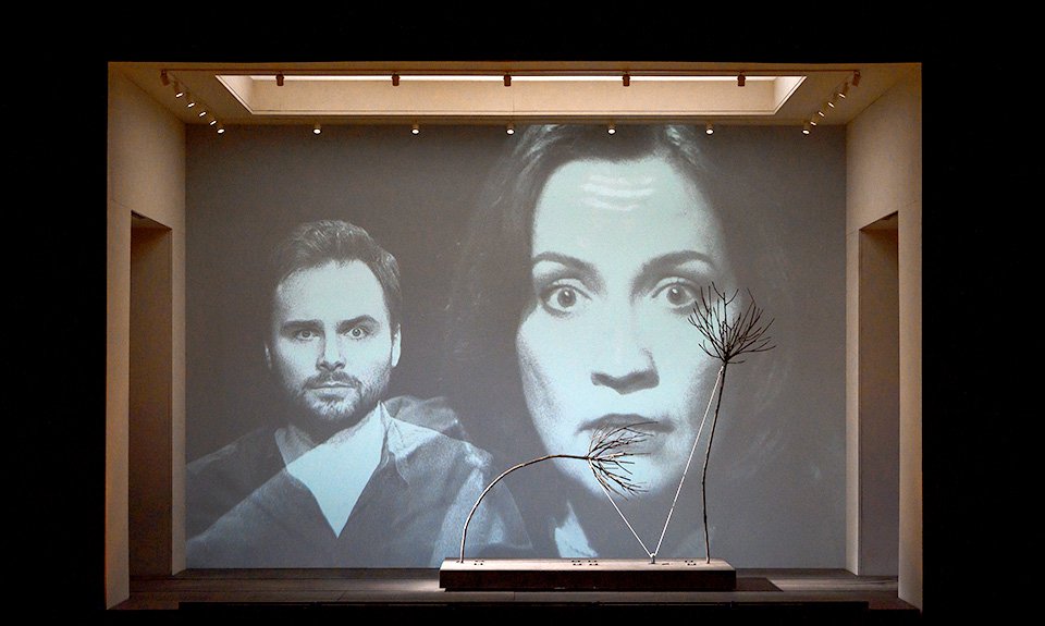 Пролог, он же увертюра, в этом смысле скорее разочаровал — зрителям выкатили «Черный квадрат» на стеночке, который в какой-то момент сорвался с гвоздя и криво повис — так, конечно, бывает в музее, но редко. Казалось, что и дальше публику будут потчевать набившими оскомину шедеврами из джентльменского набора «все, что вы должны знать о современном искусстве», но нет — далее последовали трудно опознаваемые объекты, скульптуры, фото и видео, про которые точно можно было сказать только то, что они похожи на типичные экспонаты с какой-нибудь биеннале. То вдруг возникала идиллическая видеокартинка летнего пейзажа, напоминающая о хрестоматийном Шишкине, в которой незаметно для глаза перемещалось деревце, то внезапно в драматическом дуэте появлялась ярко-желтая гигантская туфля с каблуком-лестницей, то какой-то лежащий на боку железный дровосек или огромный фиолетовый мозг. Все эти штуковины, медленно перемещавшиеся по сцене на невысоких подиумах, как будто въяве воплощая идею передвижных выставок, спорили за внимание с черно-белыми проекциями лиц исполнителей главных ролей на заднике, попадавших в камеру так, как будто они готовятся сделать селфи, полуслучайно, но очень крупно — так, что видны любые мимические нюансы. Отсутствие нарочитого театрального грима и исторических костюмов — все исполнители были в обычной одежде — явно подчеркивало желание авторов спектакля приблизить действие к нашим дням, сделать акцент на универсальности музыкальной классики.