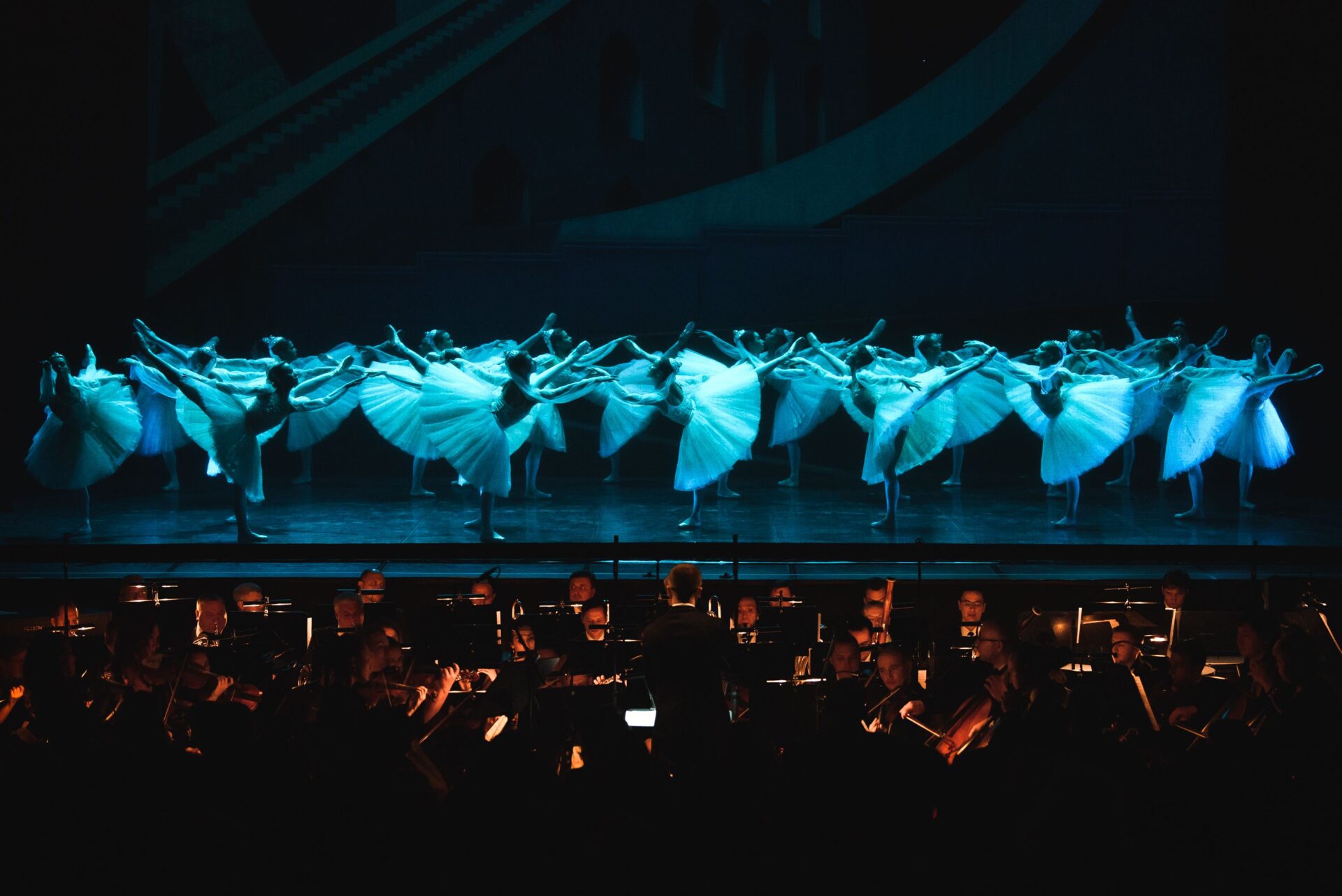 Продуманно использовалось не только время, но и пространство. Раз концерт — оркестр должен быть на сцене, а как его там разместить, если там танцуют, да ещё и с полным кордебалетом? Понятно, что никак, поэтому были убраны два первых ряда кресел, закрыта оркестровая яма, и на получившейся таким образом площадке разместился оркестр. Это был отличный подарок зрителям: музыканты были совсем близко, и в кои-то веки можно было рассмотреть не только дирижёра, но и каждого из оркестрантов.