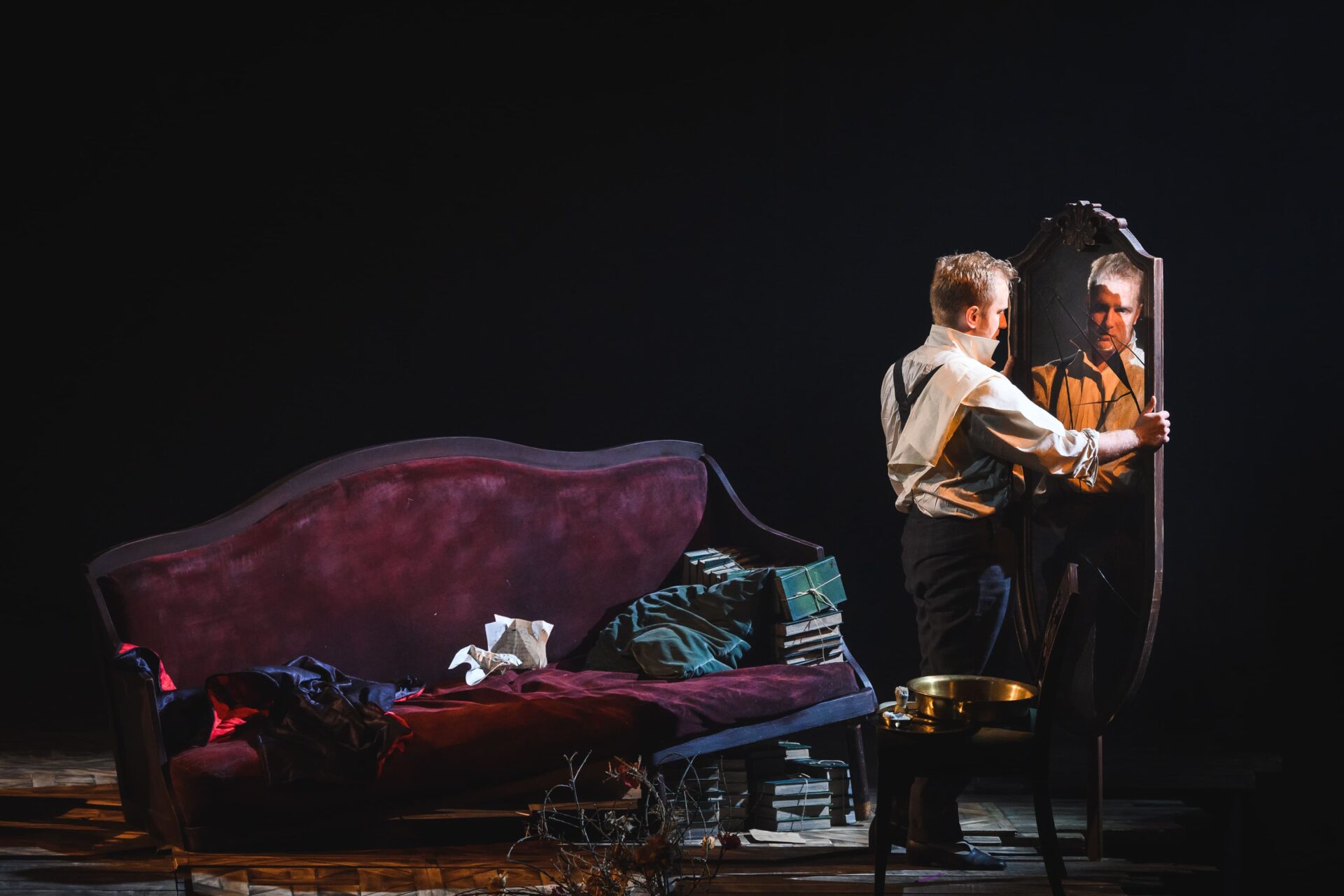 Здесь — те же трансформации и аберрации. Евгений Онегин в этом спектакле — унылый, опустившийся, разорившийся помещик, который, лежа на диване в засаленном шлафроке, предается воспоминаниям об ошибках юности, и все действие — это проекция его воспоминаний. Как в «Солярисе», здесь парадный канделябр свисает прямо с неба, по которому плывут облака, а место действия вырвано из реальности, как клякса, — подобный эффект часто встречается в картинах Рене Магритта — и помещено «в никуда»: вокруг неровного пятачка воспоминаний ничего нет, даже кулис и задника (сценограф — сам Владиславс Наставшевс).