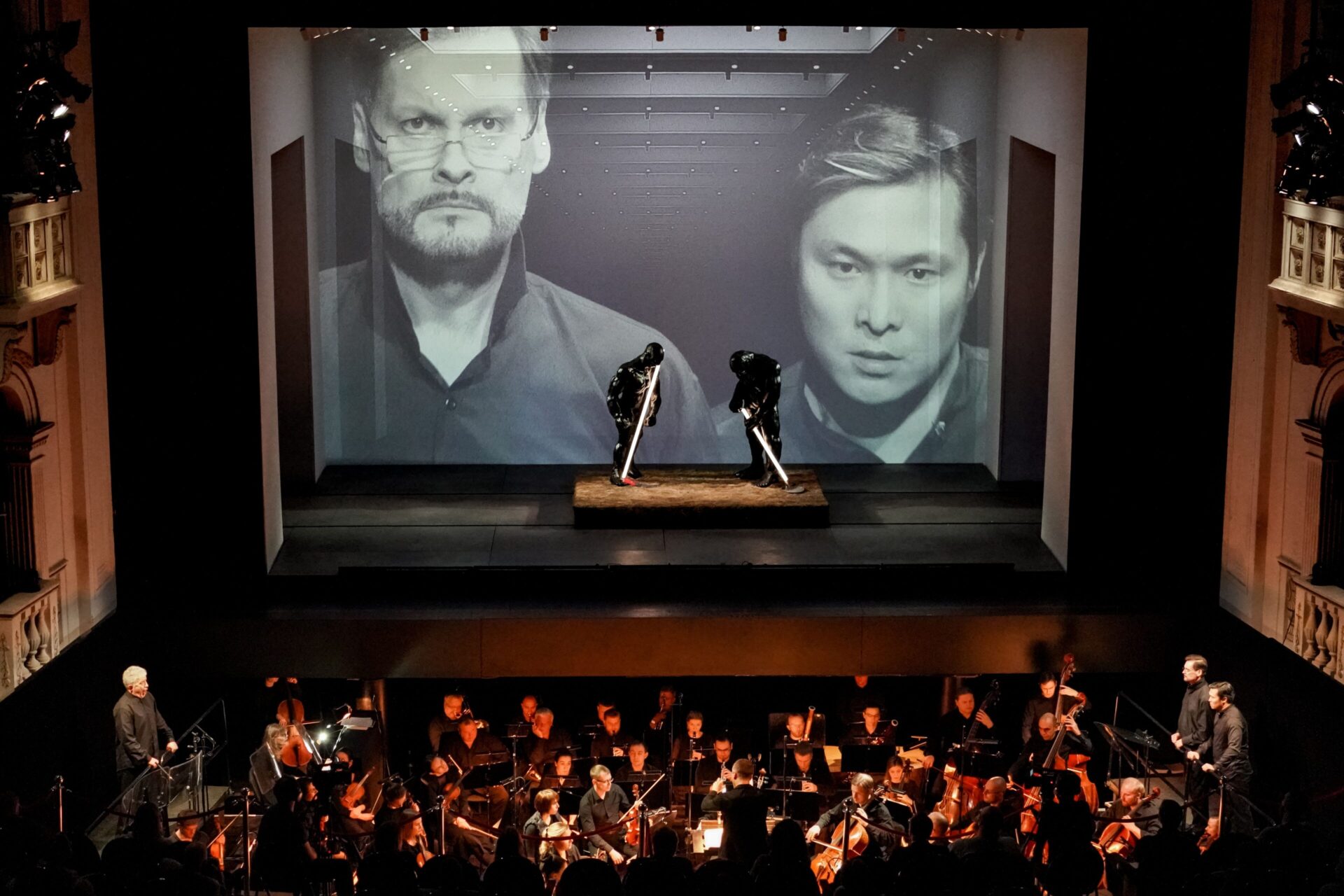 Первое, что удивляет зрителя, вошедшего в зал, — отсутствие бортика в оркестровой яме. Если обычно во время спектакля музыканты невидимы, и мы о них практически забываем, то здесь они словно становятся действующими лицами, в чем-то заменяя второстепенных персонажей.