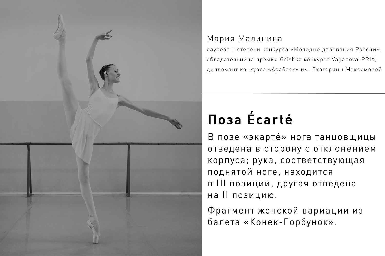В позе «экарте́» нога танцовщицы отведена в сторону с отклонением корпуса; рука, соответствующая поднятой ноге, находится в III позиции, другая отведена на II позицию.