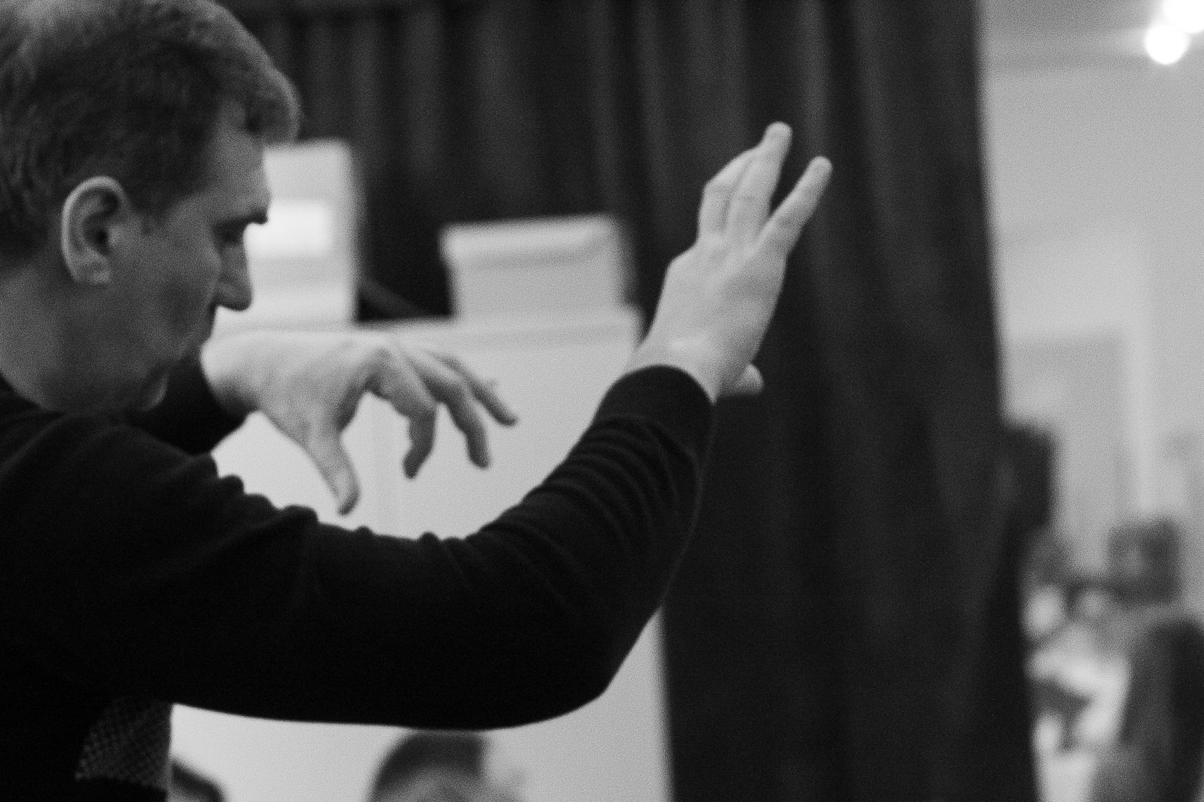 Начинается репетиция хора. Артисты приходят почти как этот субботний снег: все расслабленно перешучиваются, листают партитуры. Обнаруживается, что у одного из певцов сегодня день рождения, откуда-то появляется коробка конфет, еще несколько шуток и много поздравлений. В зал влетает репетитор по вокалу, начинается распевка. Этот человек почему-то мне напоминает своими жестами молодого Охлобыстина — который из «Даун Хауса», а не современного и неприятного. Распевка похожа на зарядку — и даже не тем, что все артисты двигаются, а скорее тем, что педагог, давая одно задание за другим, будто заряжает всех пришедших. Шутить начинают массово, смеха становится больше; вообще не первое даже уже десятилетие замечаю, что чем глубже и искренней человек погружен в свое дело — в искусство, науку, в общем, труд — тем чаще он является добродушной ехидной и язвой. За первые десять минут создается впечатление, что здесь все такие.
