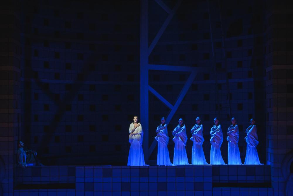Еще один искусствоведческий пунктир пермской «Нормы» протягивается к утопической «бумажной архитектуре» с ее архетипами архитектурного воображения — башнями, мостами, пустынными пространствами и т.д. Эти фантазии в спектакле напоминают порой потусторонние макабры. Так, например, когда в центре сцены, у порталов которой высятся две башни, напоминающие о Вавилонской (а заодно — о гордыне и пороке, уничтоживших вавилонский мир), а задник, облицованный кафелем — глухо замыкает пространство, как могильник, вдруг из-под сцены поднимаются призрачные фигуры с темными глазницами и, подняв копья, поют «Пусть вдребезги рассыплется этот смертельный для нас мир!», все это наводит на мысль о более глубоких тайнах и замыслах мироздания, а также о хрупкости человеческой жизни, которая легко может быть сметена и историческими, и невидимыми силами.