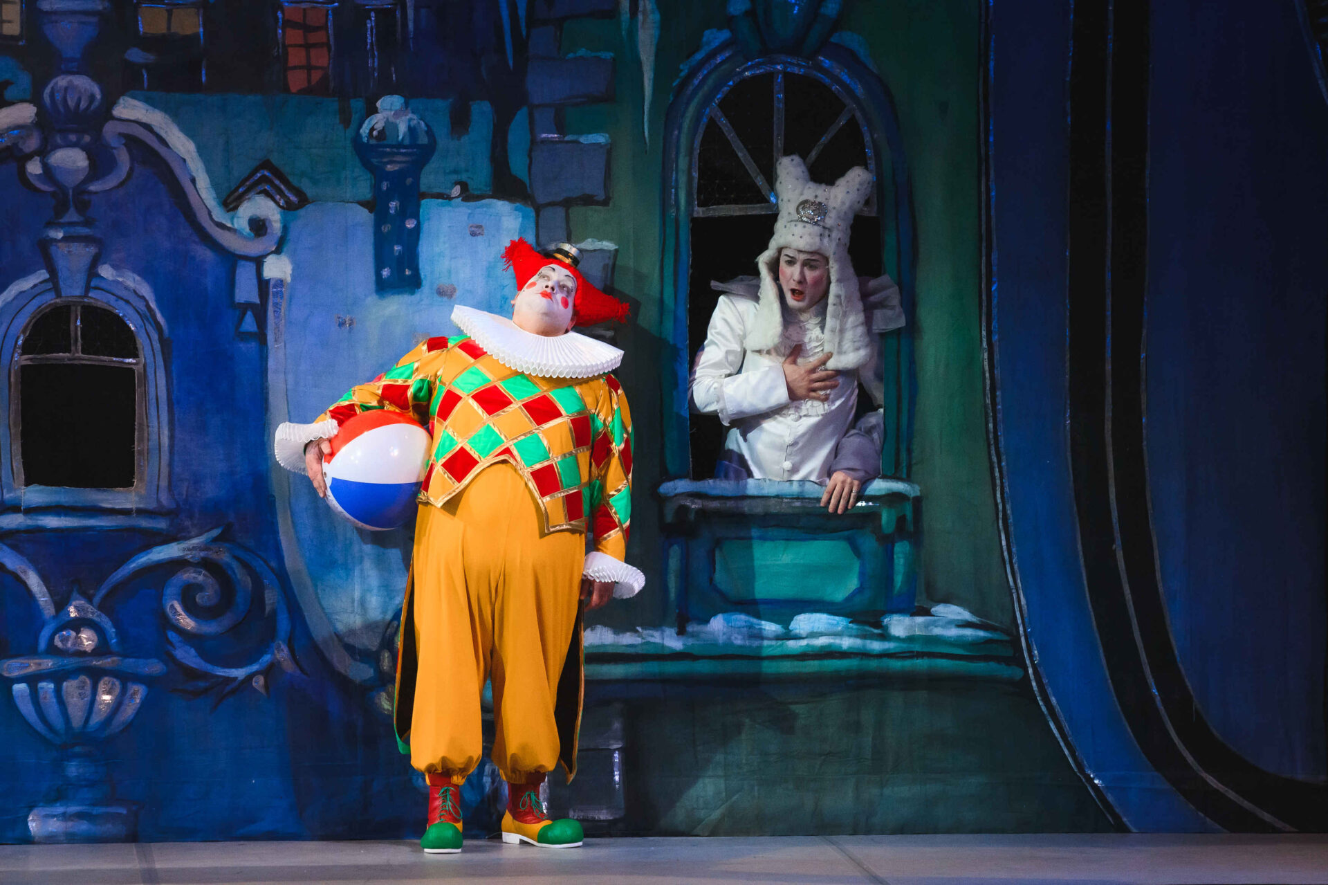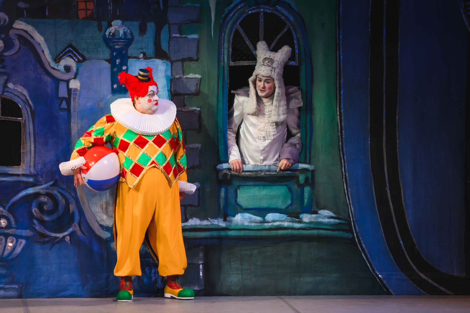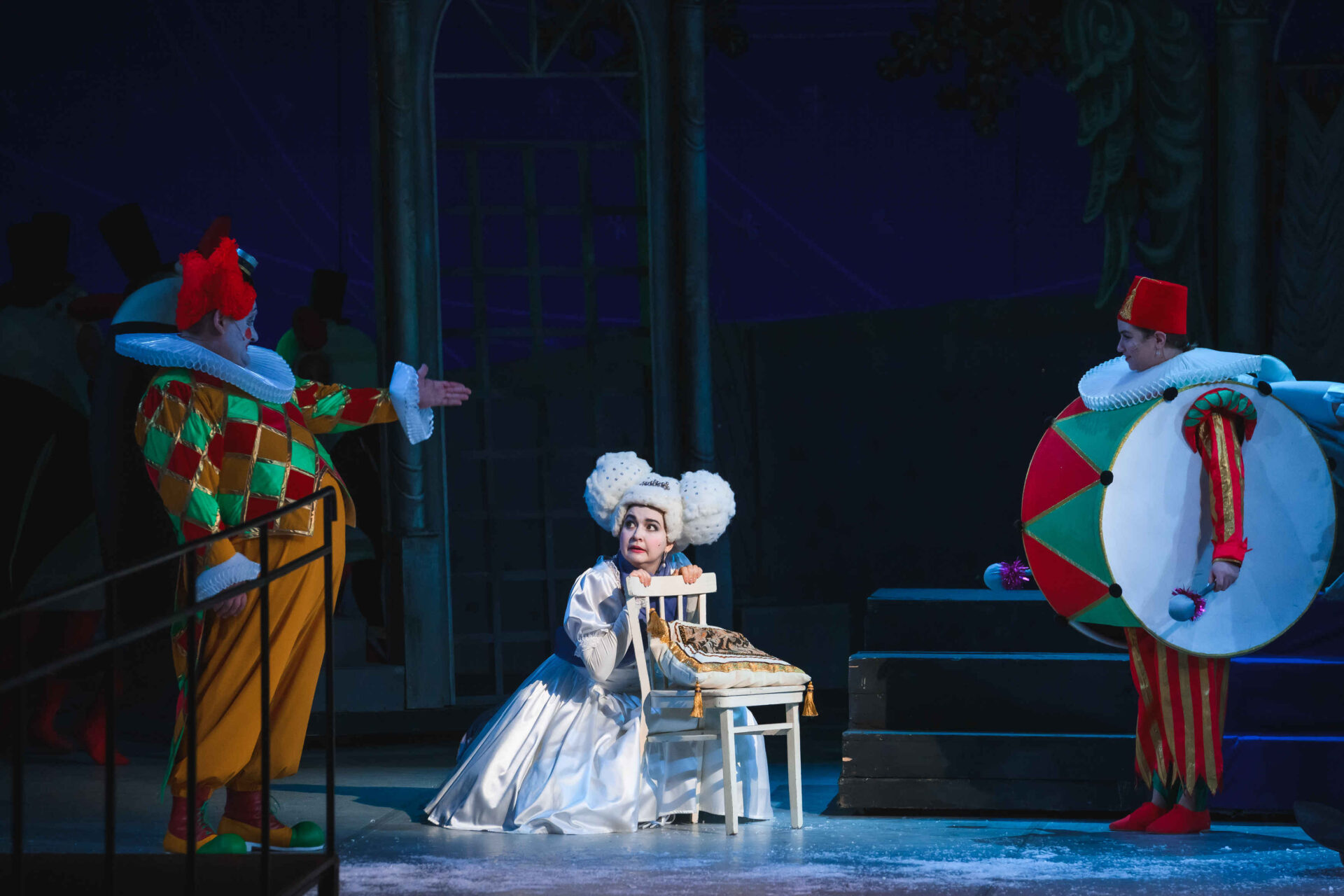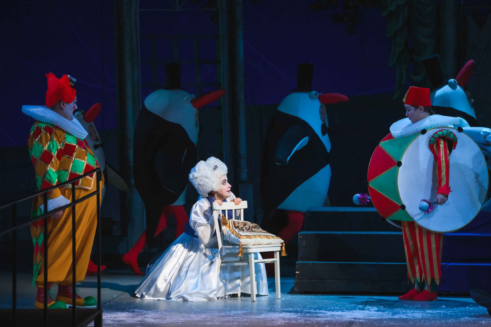 Музыкальные инструменты так понравились Слезабете, чтоона тут же перестала плакать и повеселела. Вместе с Бумом, Дзинь и клоунами, Рыжим и Белым, Принцесса устроила танцы. Разумеется, от их шумного веселья проснулись Король с Королевой. Ох и рассердился Снежный Король! Дочери он велел отправляться в постель, а других нарушителей его спокойствия заточил в темницу.