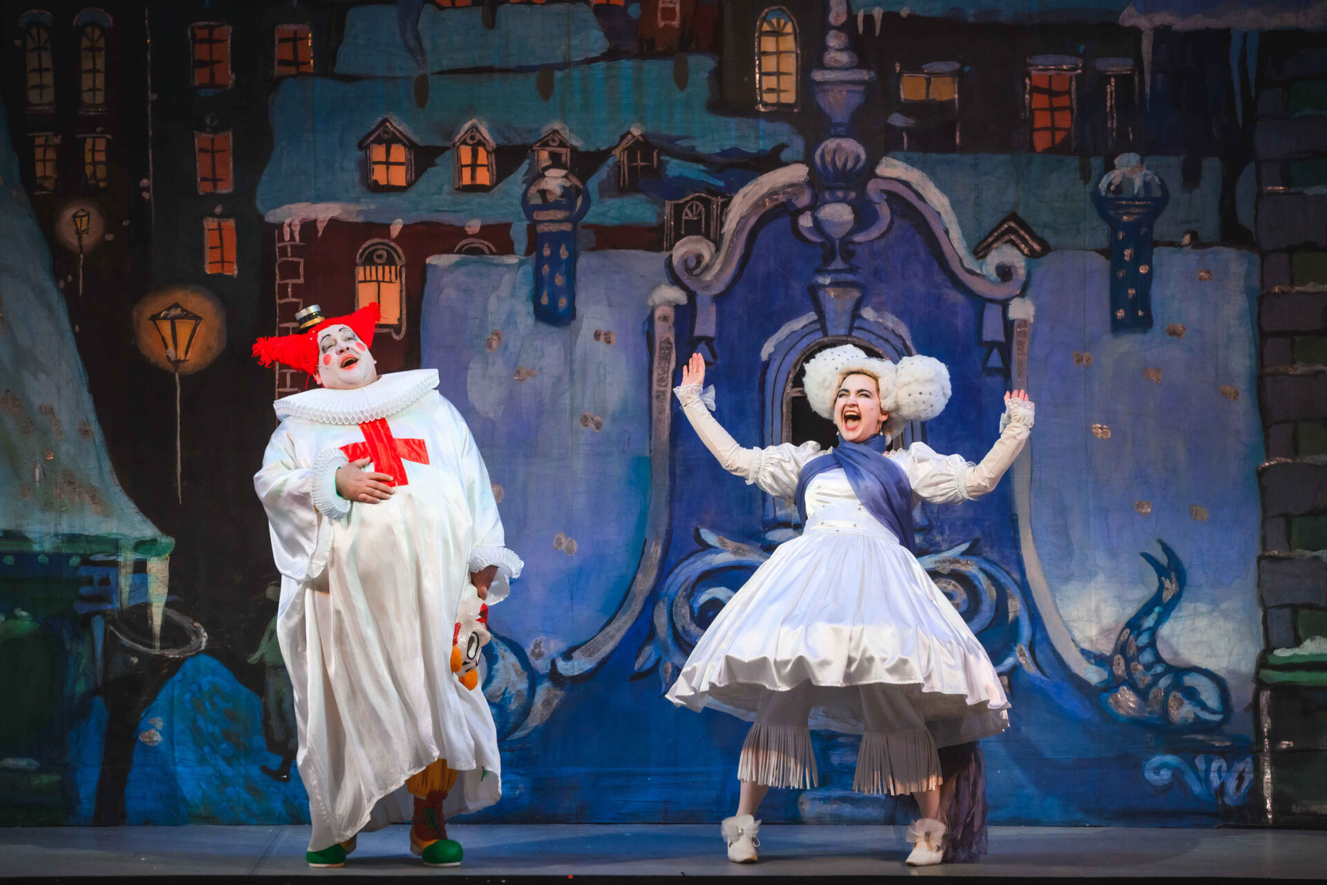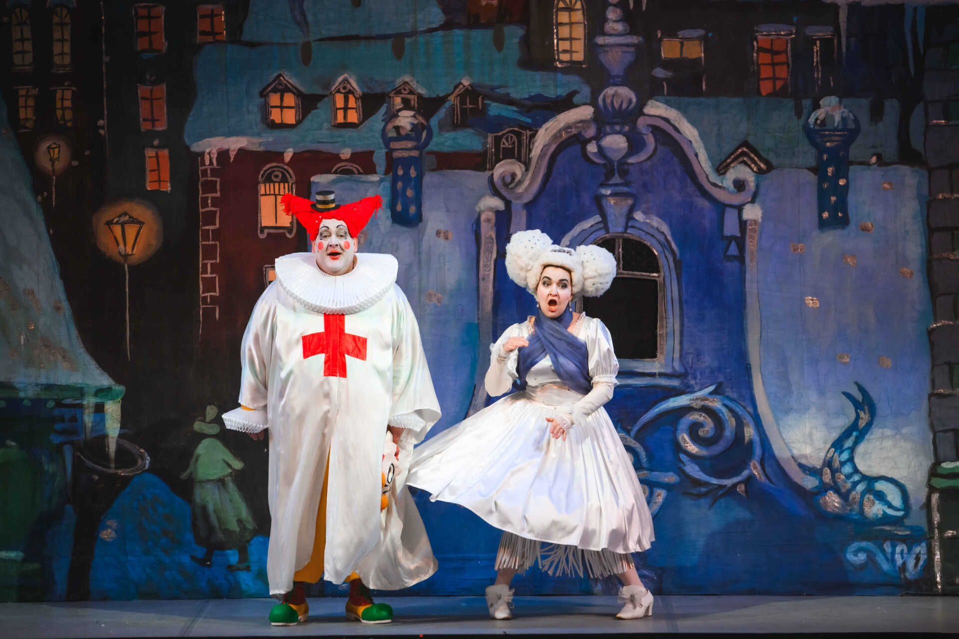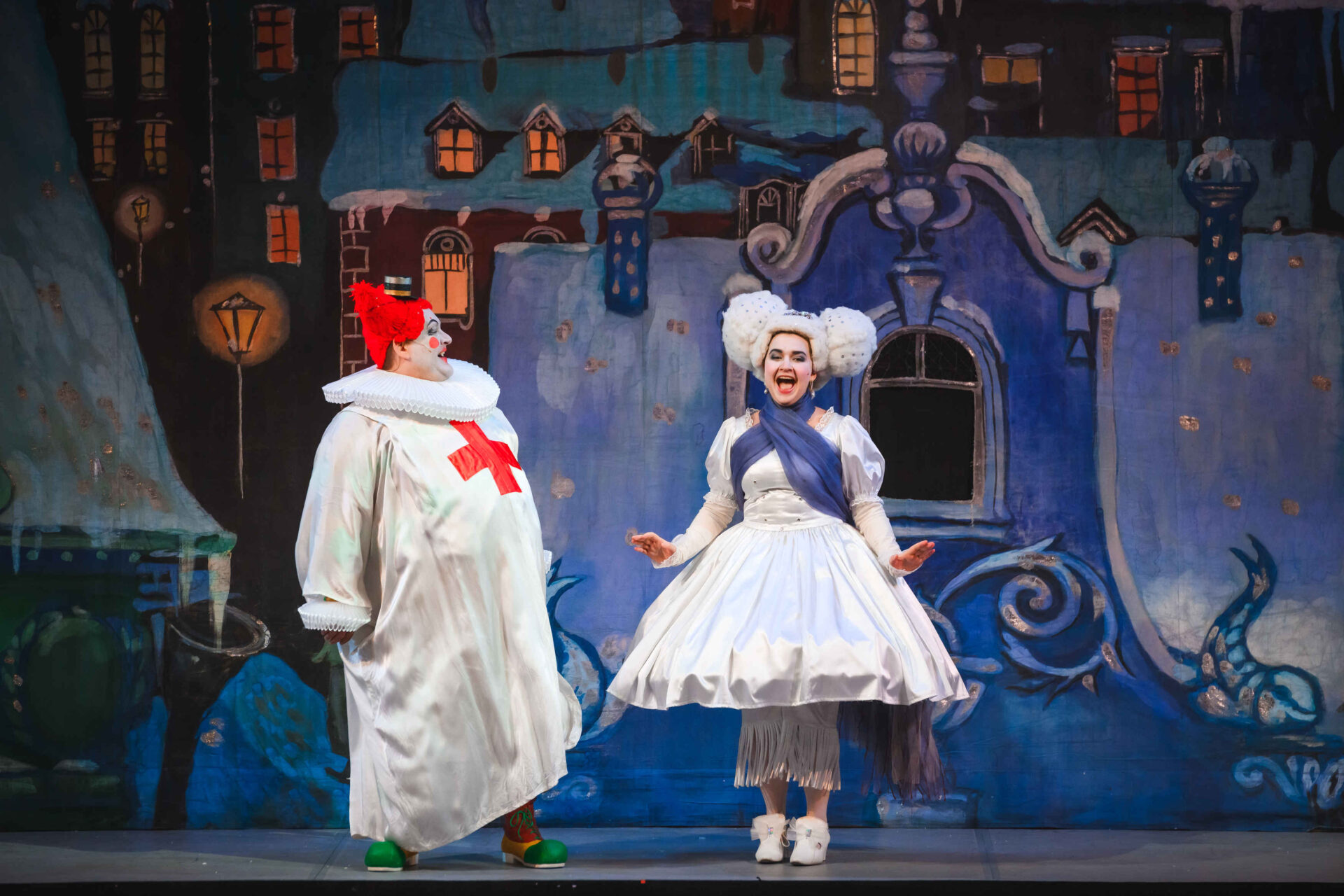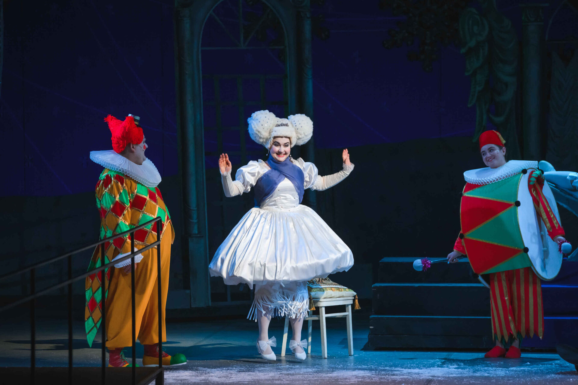 Музыкальные инструменты так понравились Слезабете, чтоона тут же перестала плакать и повеселела. Вместе с Бумом, Дзинь и клоунами, Рыжим и Белым, Принцесса устроила танцы. Разумеется, от их шумного веселья проснулись Король с Королевой. Ох и рассердился Снежный Король! Дочери он велел отправляться в постель, а других нарушителей его спокойствия заточил в темницу.