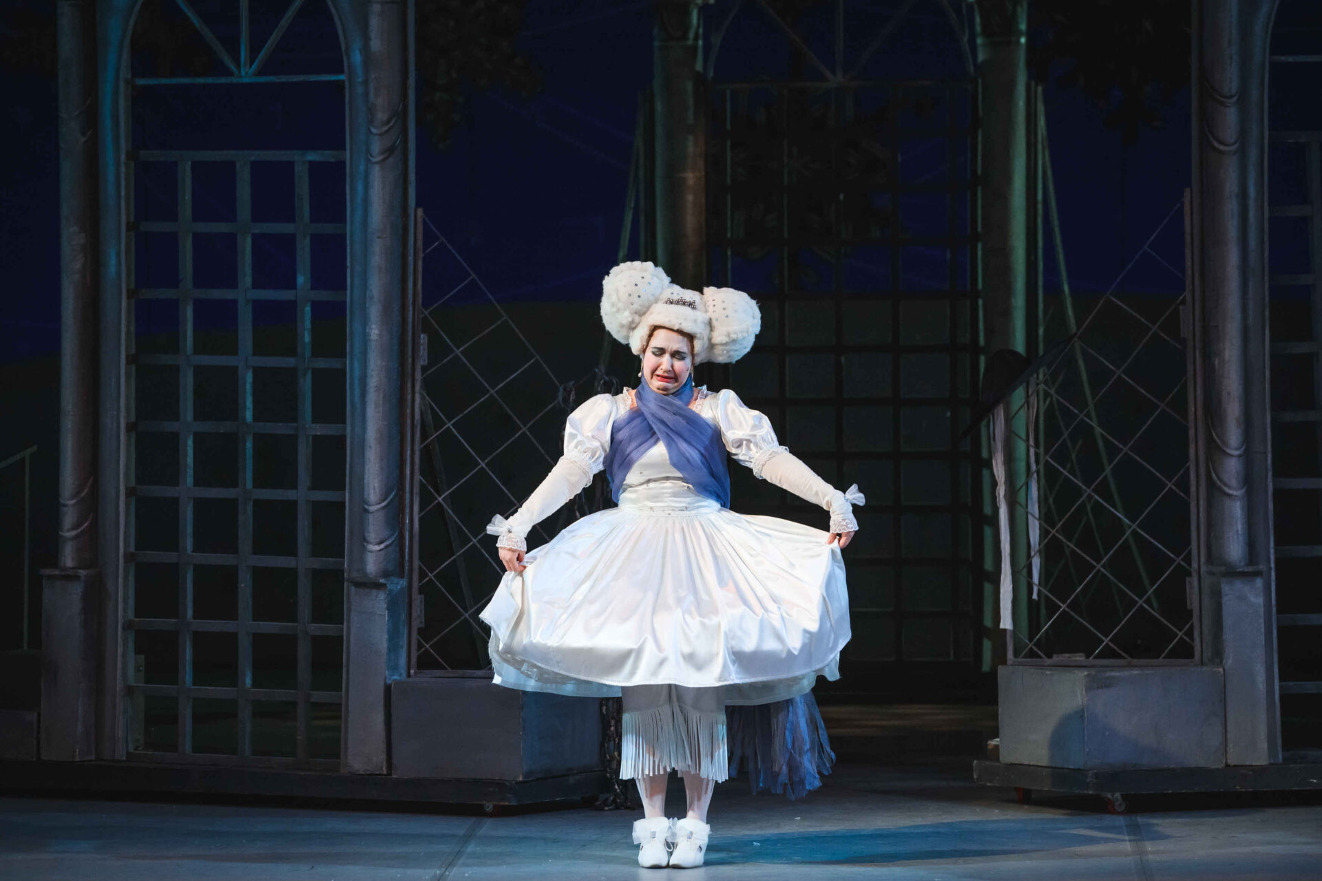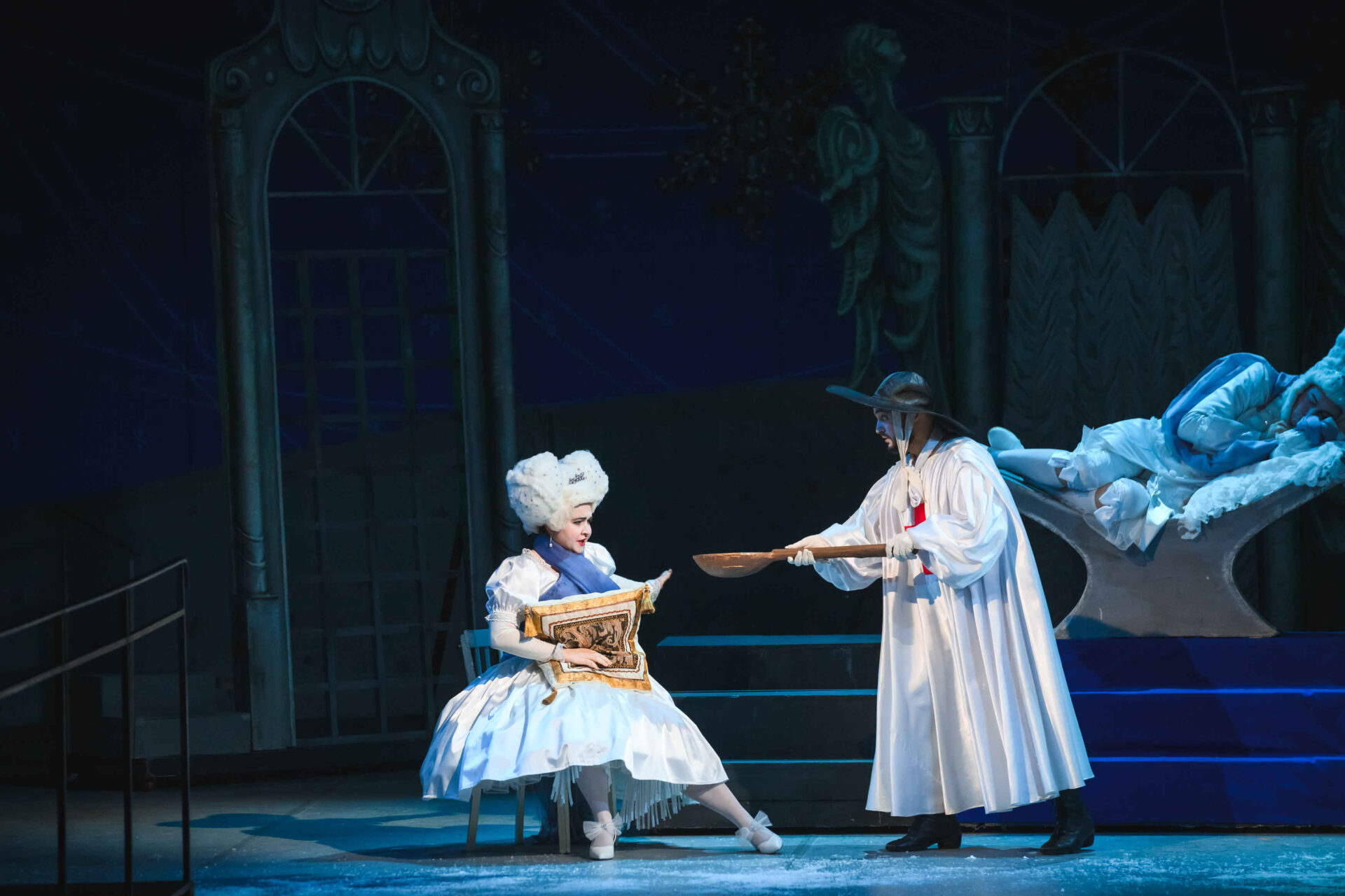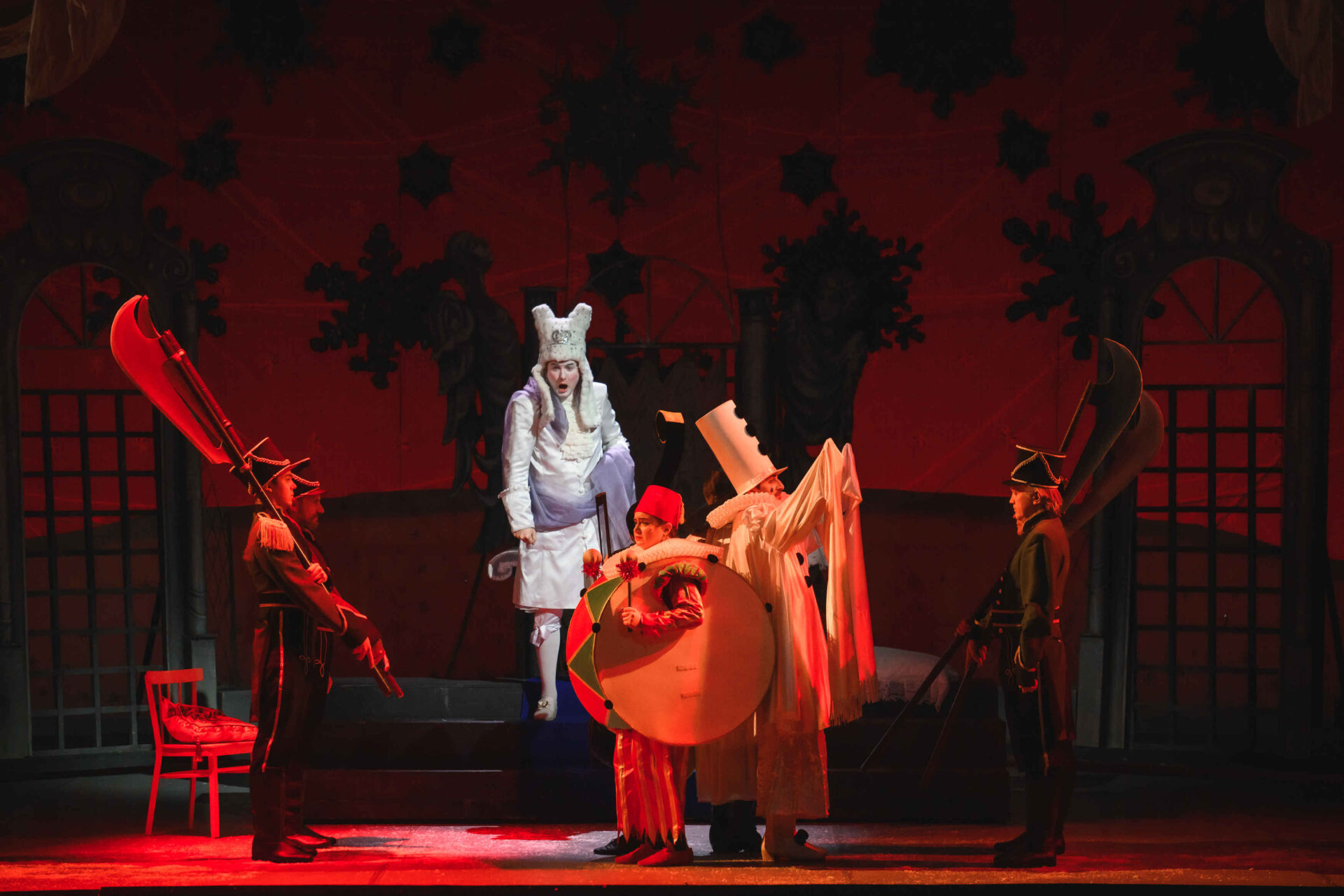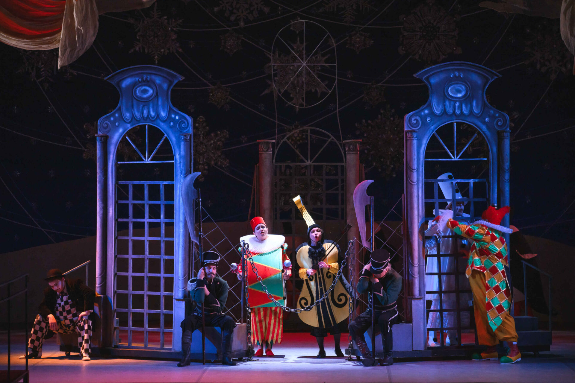 Музыкальные инструменты так понравились Слезабете, чтоона тут же перестала плакать и повеселела. Вместе с Бумом, Дзинь и клоунами, Рыжим и Белым, Принцесса устроила танцы. Разумеется, от их шумного веселья проснулись Король с Королевой. Ох и рассердился Снежный Король! Дочери он велел отправляться в постель, а других нарушителей его спокойствия заточил в темницу.