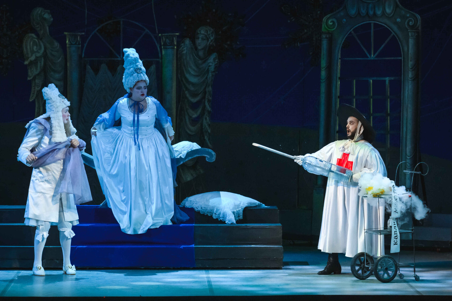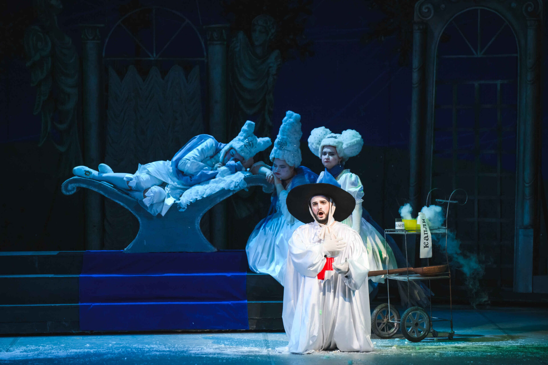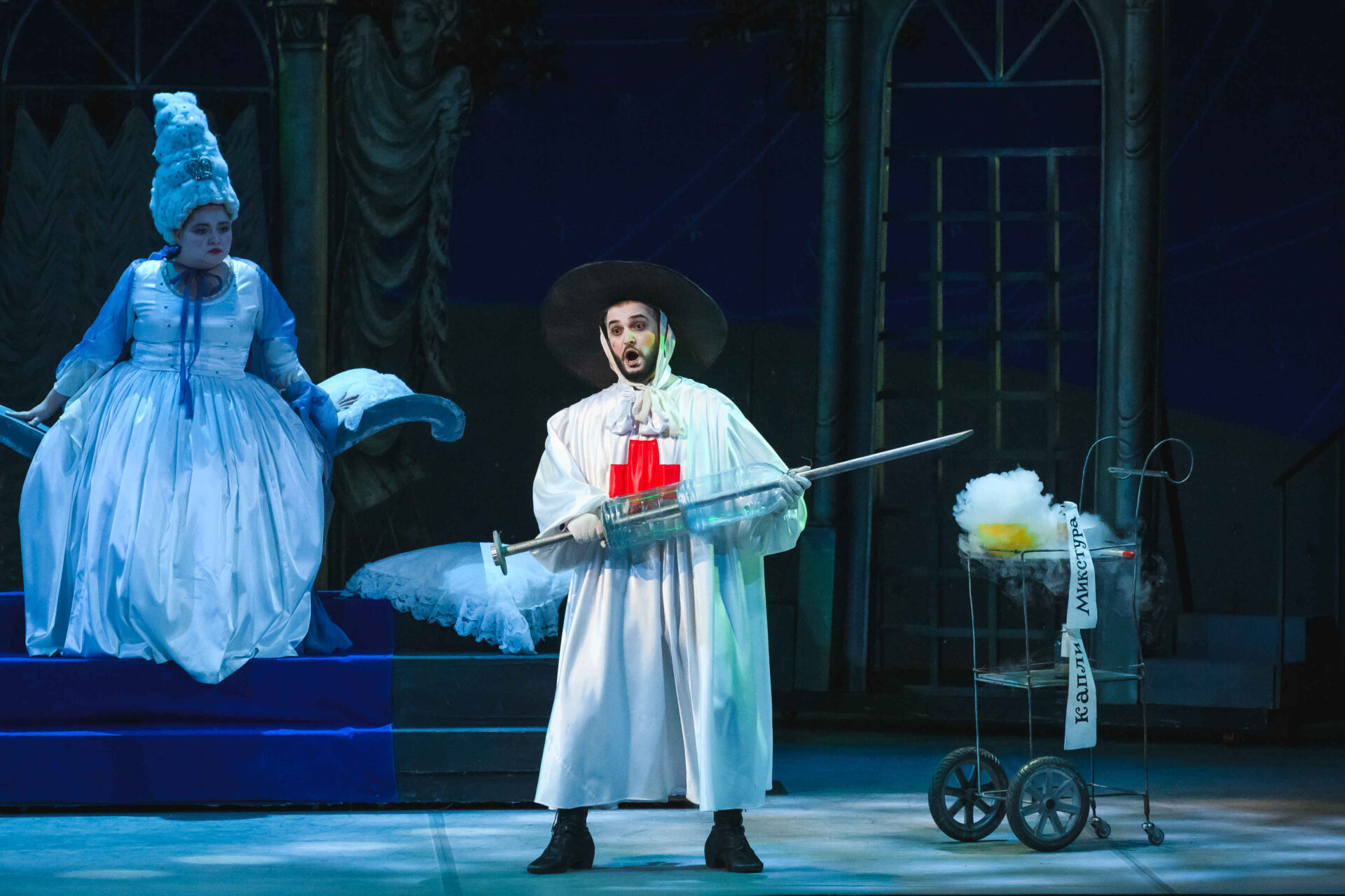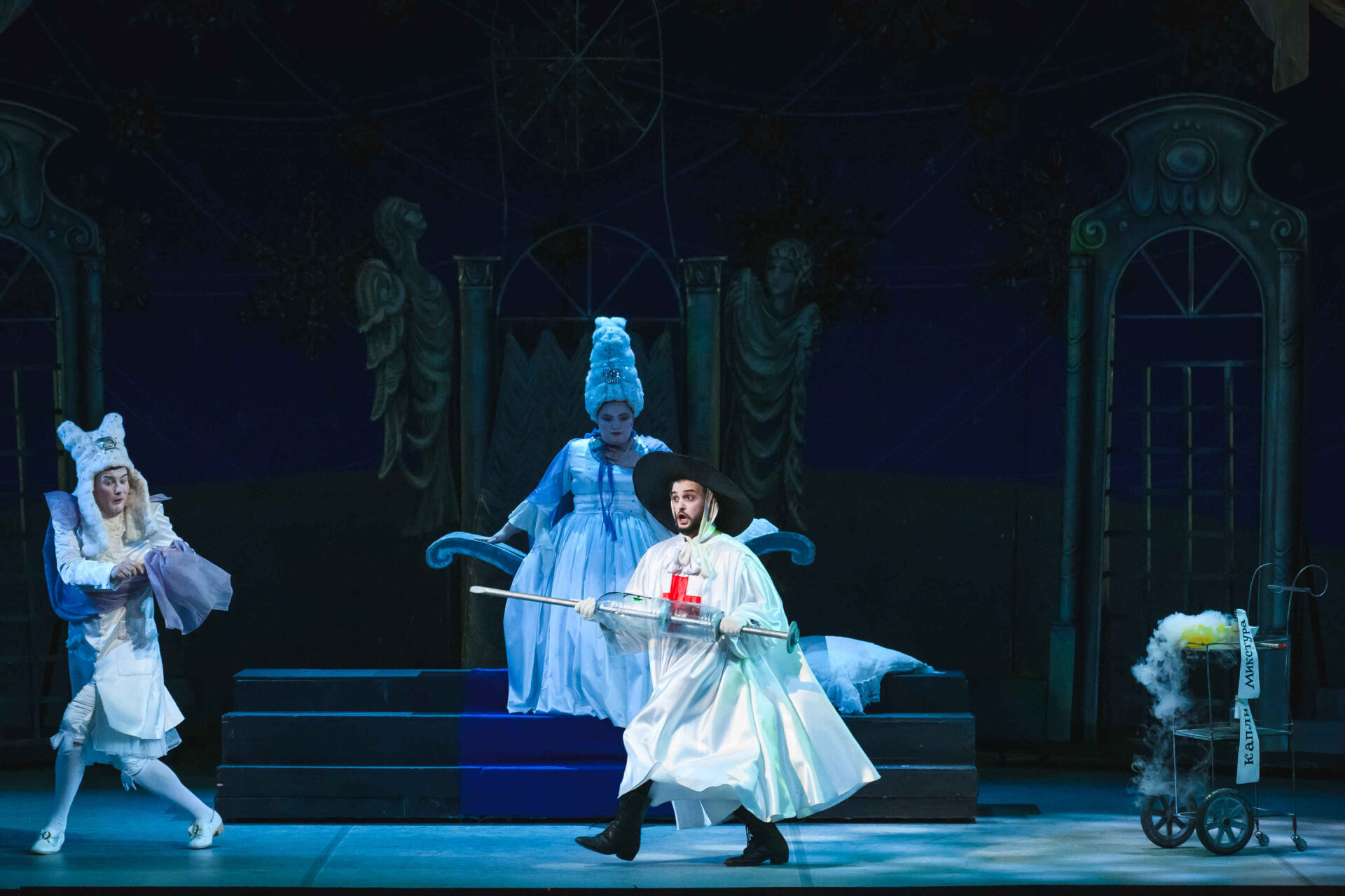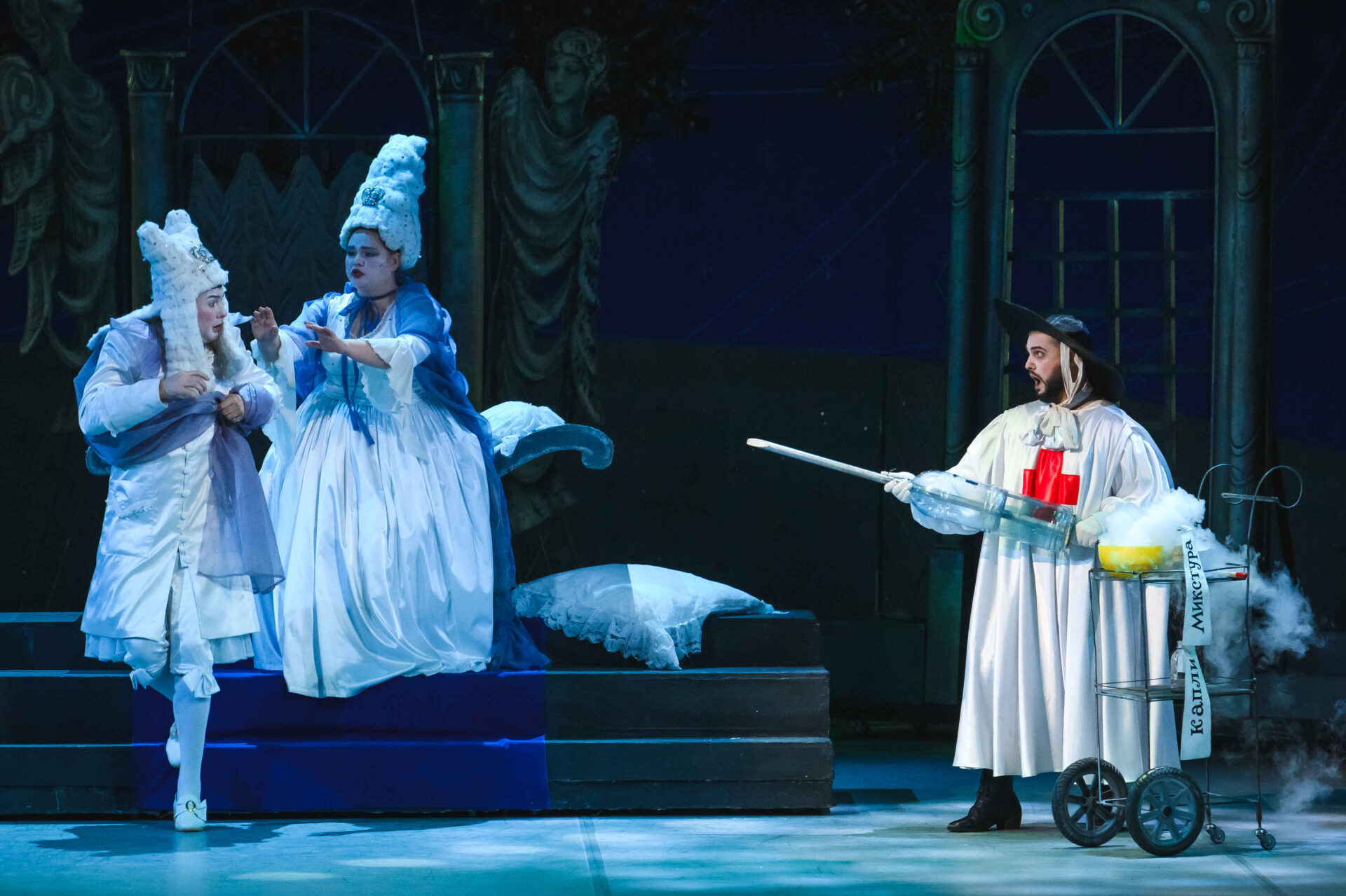 Затем пришла пора познакомиться с оперными голосами. Артист, что поет низким голосом, — это бас. В спектакле он играет Короля. Дама с густым голосом — меццо-сопрано — и это, конечно, Королева. Бархатистый мужской голос — баритон. Его обладатель выступит в роли Доктора Шприца. Девушка, голос которой напоминает одновременно журчание ручейка и соловьиные трели, — колоратурное сопрано. Она — Принцесса. Еще не забудем о теноре — это мужской голос, высокий и лирический. В нашем спектакле он принадлежит Сыщику.