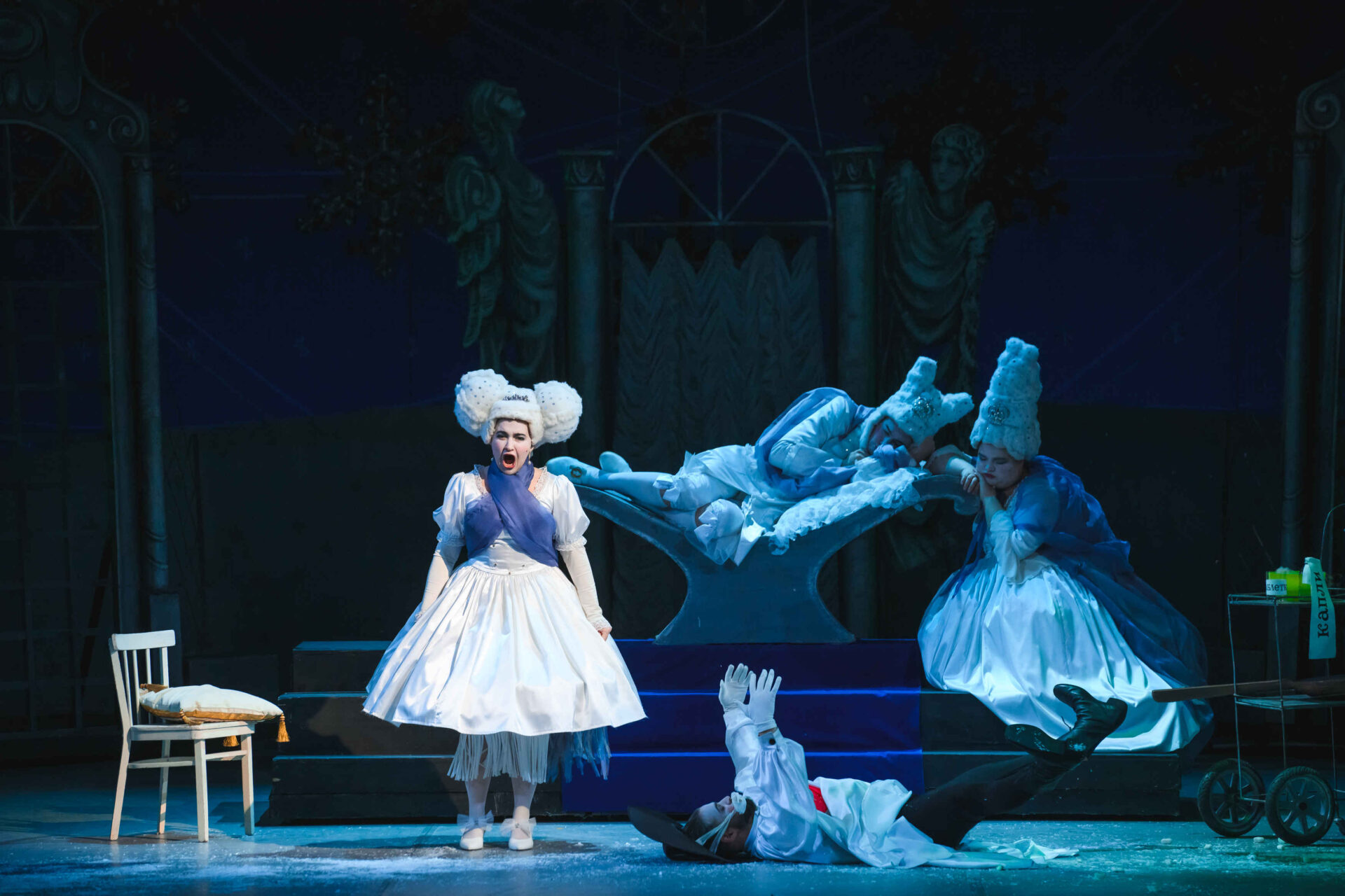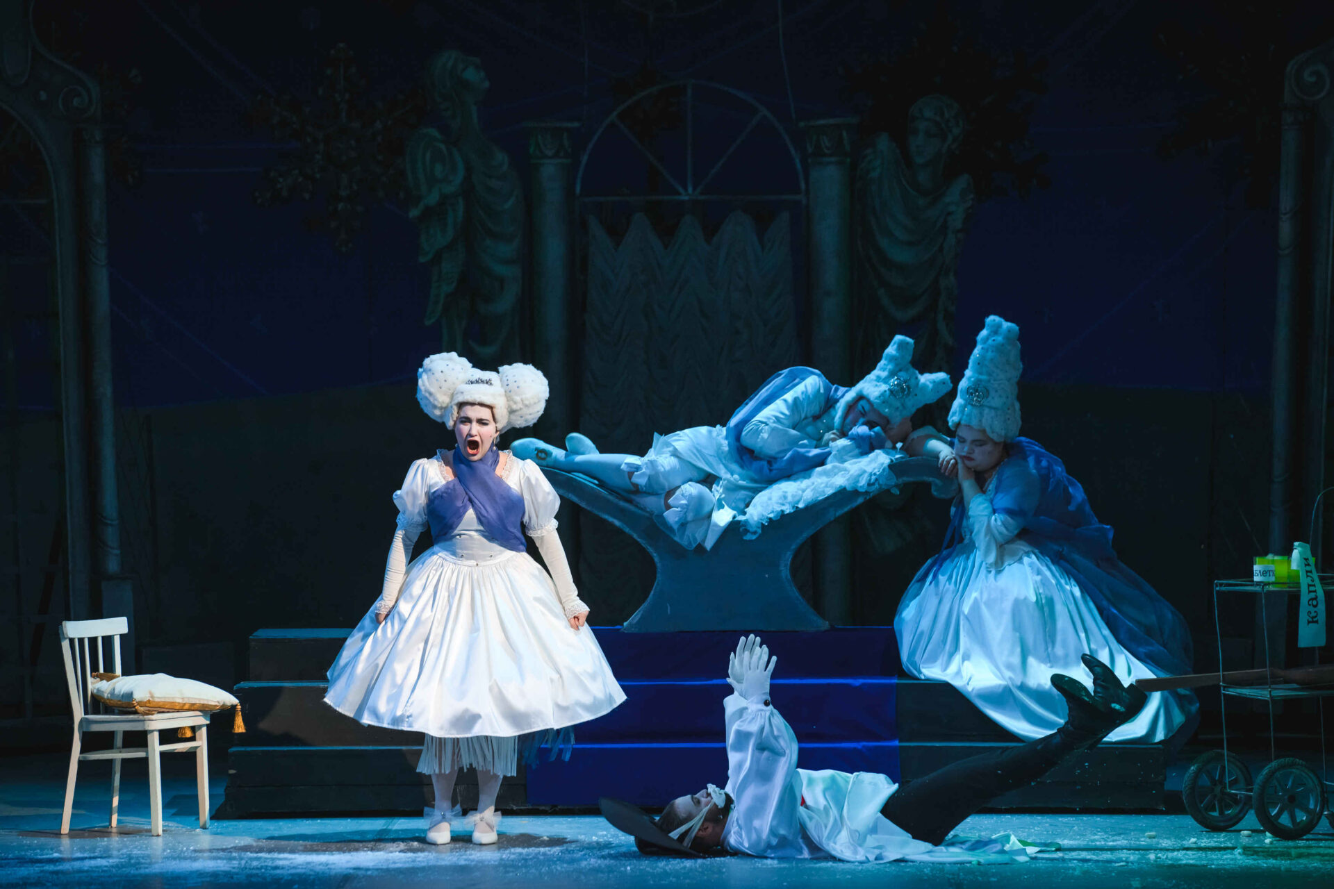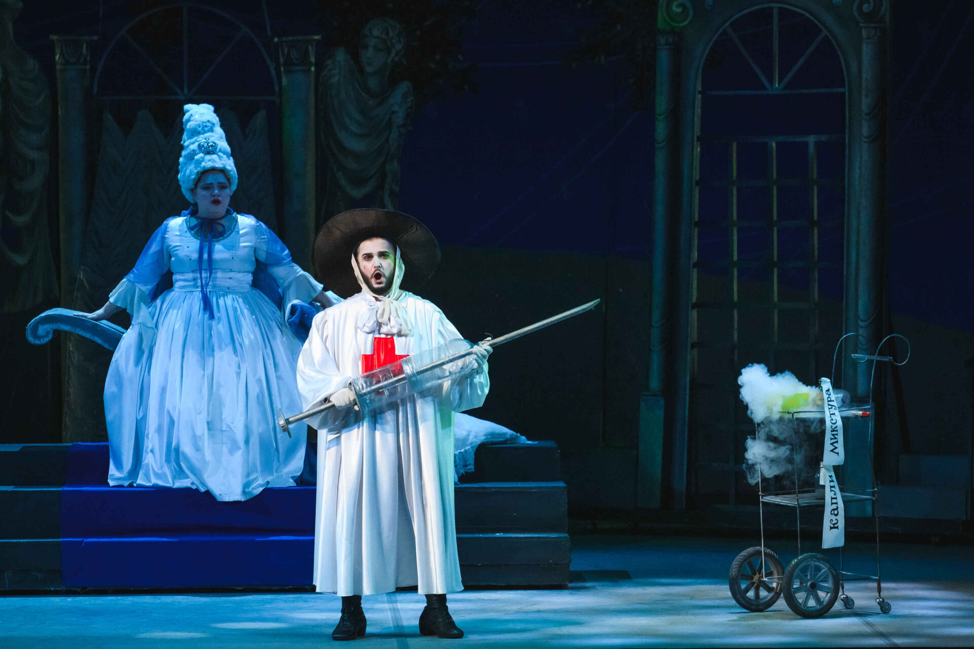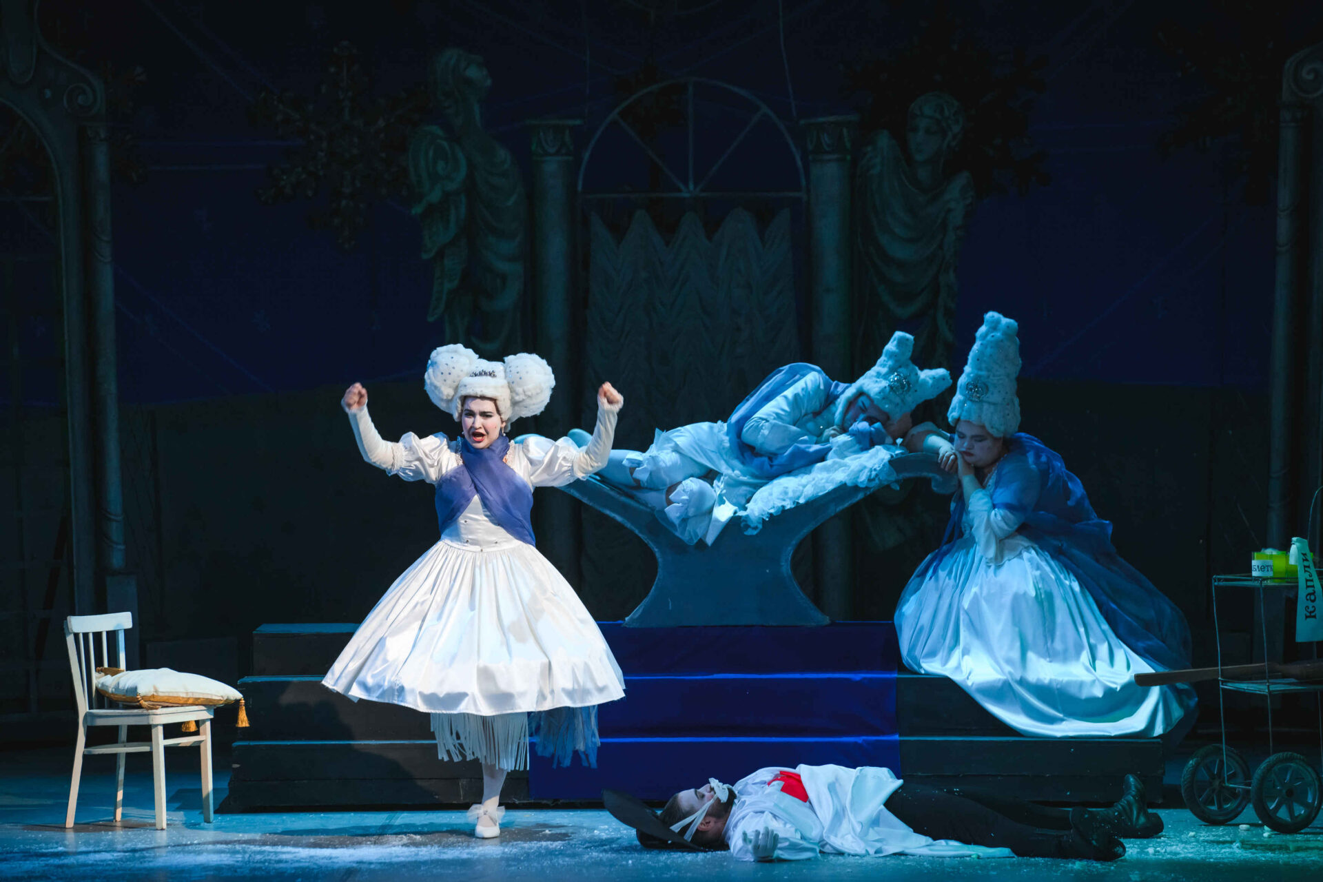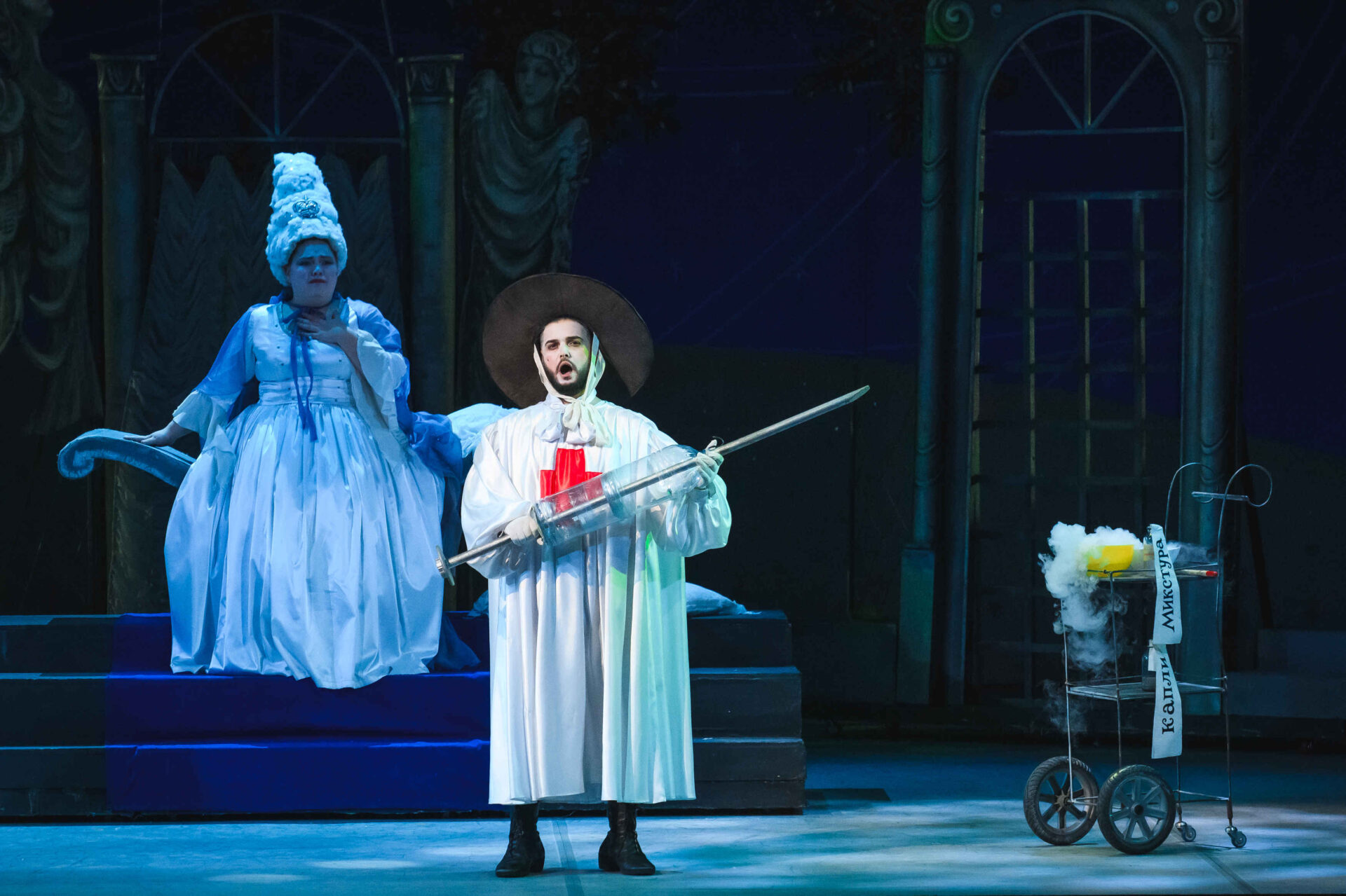 Затем пришла пора познакомиться с оперными голосами. Артист, что поет низким голосом, — это бас. В спектакле он играет Короля. Дама с густым голосом — меццо-сопрано — и это, конечно, Королева. Бархатистый мужской голос — баритон. Его обладатель выступит в роли Доктора Шприца. Девушка, голос которой напоминает одновременно журчание ручейка и соловьиные трели, — колоратурное сопрано. Она — Принцесса. Еще не забудем о теноре — это мужской голос, высокий и лирический. В нашем спектакле он принадлежит Сыщику.
