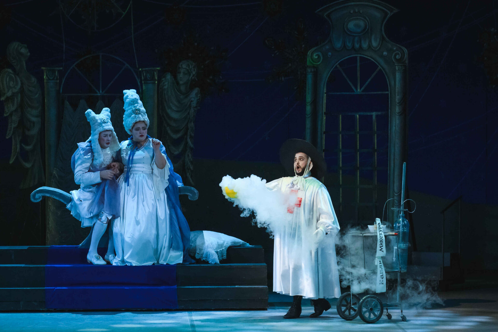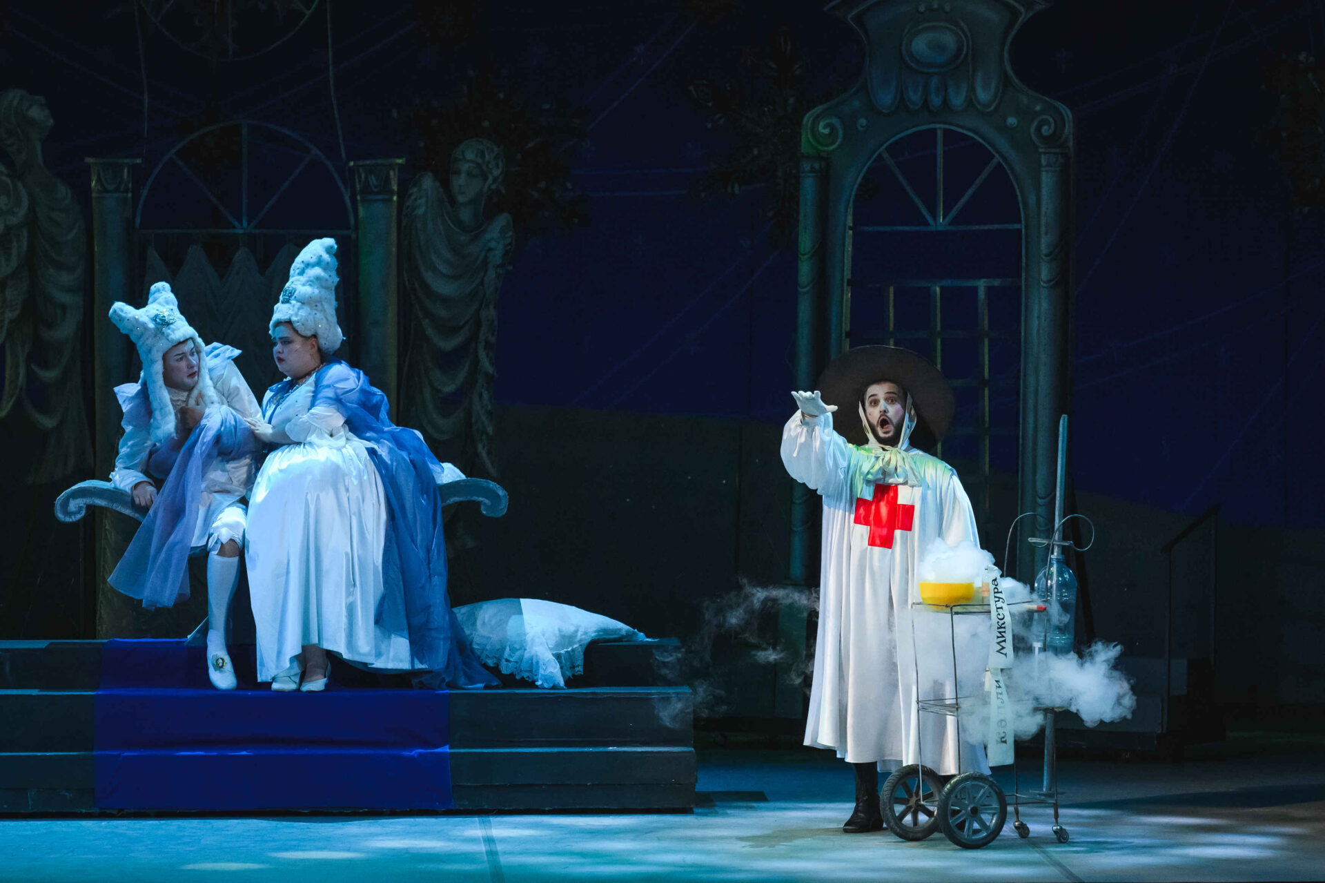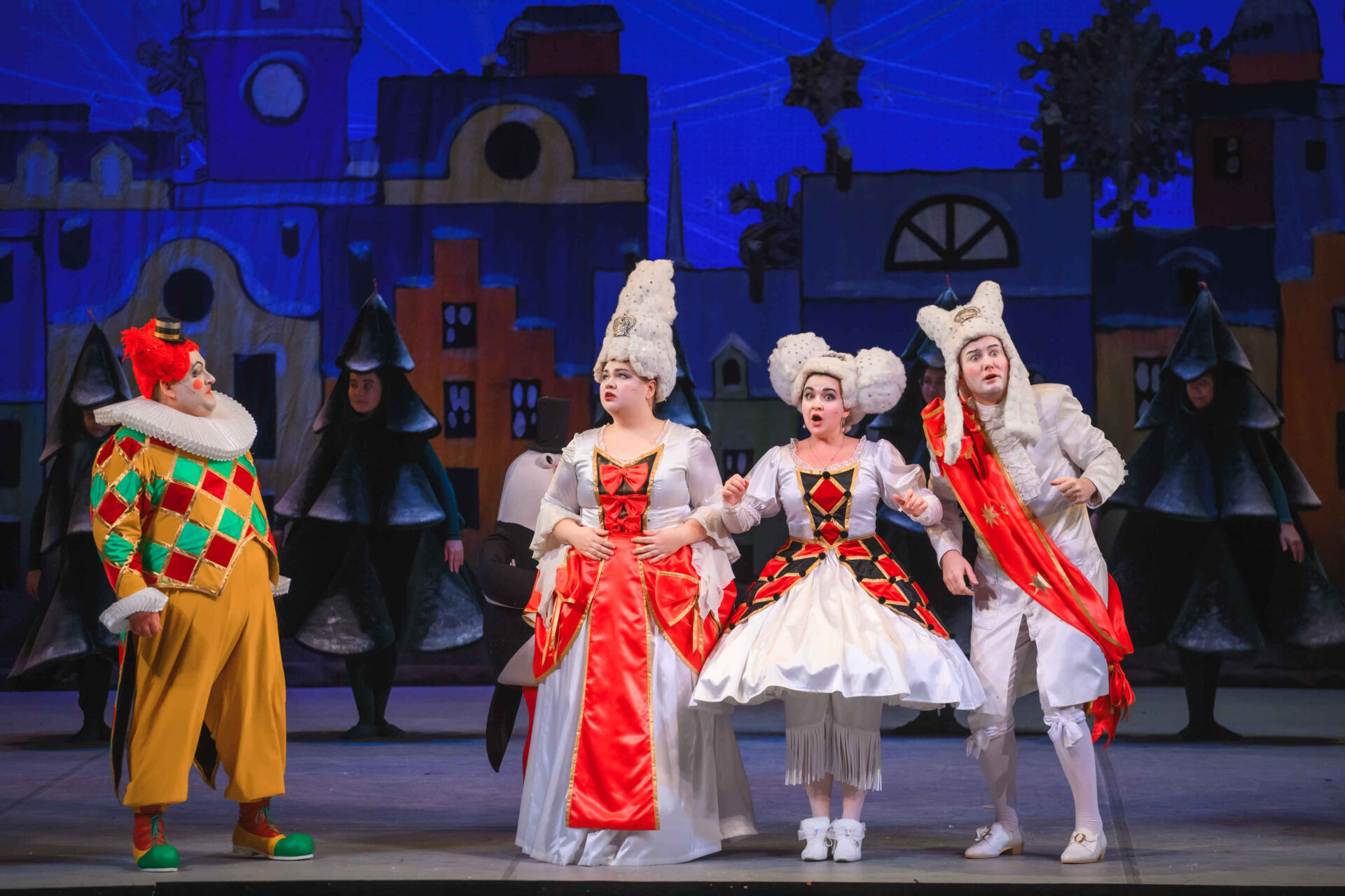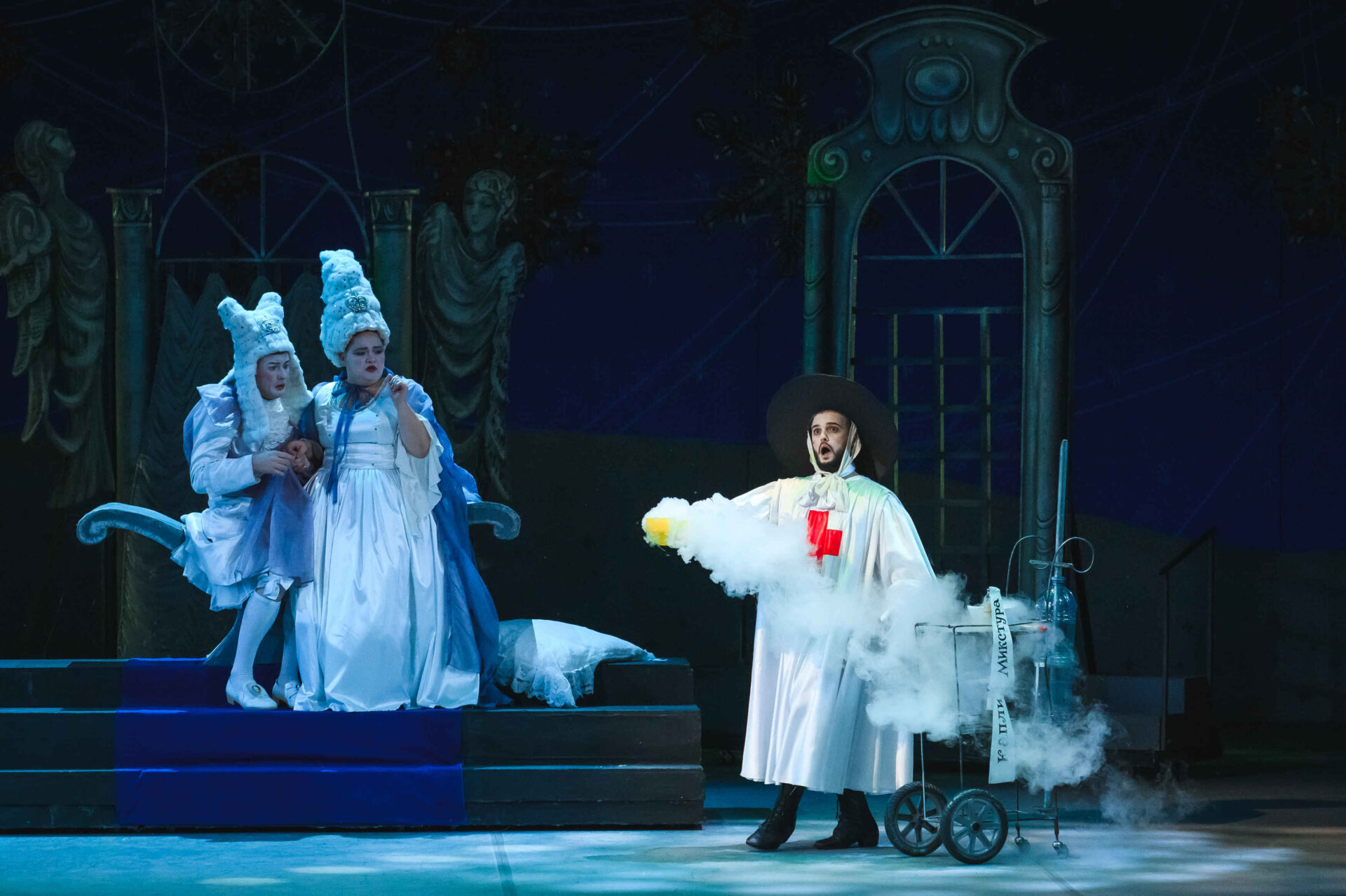 Затем пришла пора познакомиться с оперными голосами. Артист, что поет низким голосом, — это бас. В спектакле он играет Короля. Дама с густым голосом — меццо-сопрано — и это, конечно, Королева. Бархатистый мужской голос — баритон. Его обладатель выступит в роли Доктора Шприца. Девушка, голос которой напоминает одновременно журчание ручейка и соловьиные трели, — колоратурное сопрано. Она — Принцесса. Еще не забудем о теноре — это мужской голос, высокий и лирический. В нашем спектакле он принадлежит Сыщику.