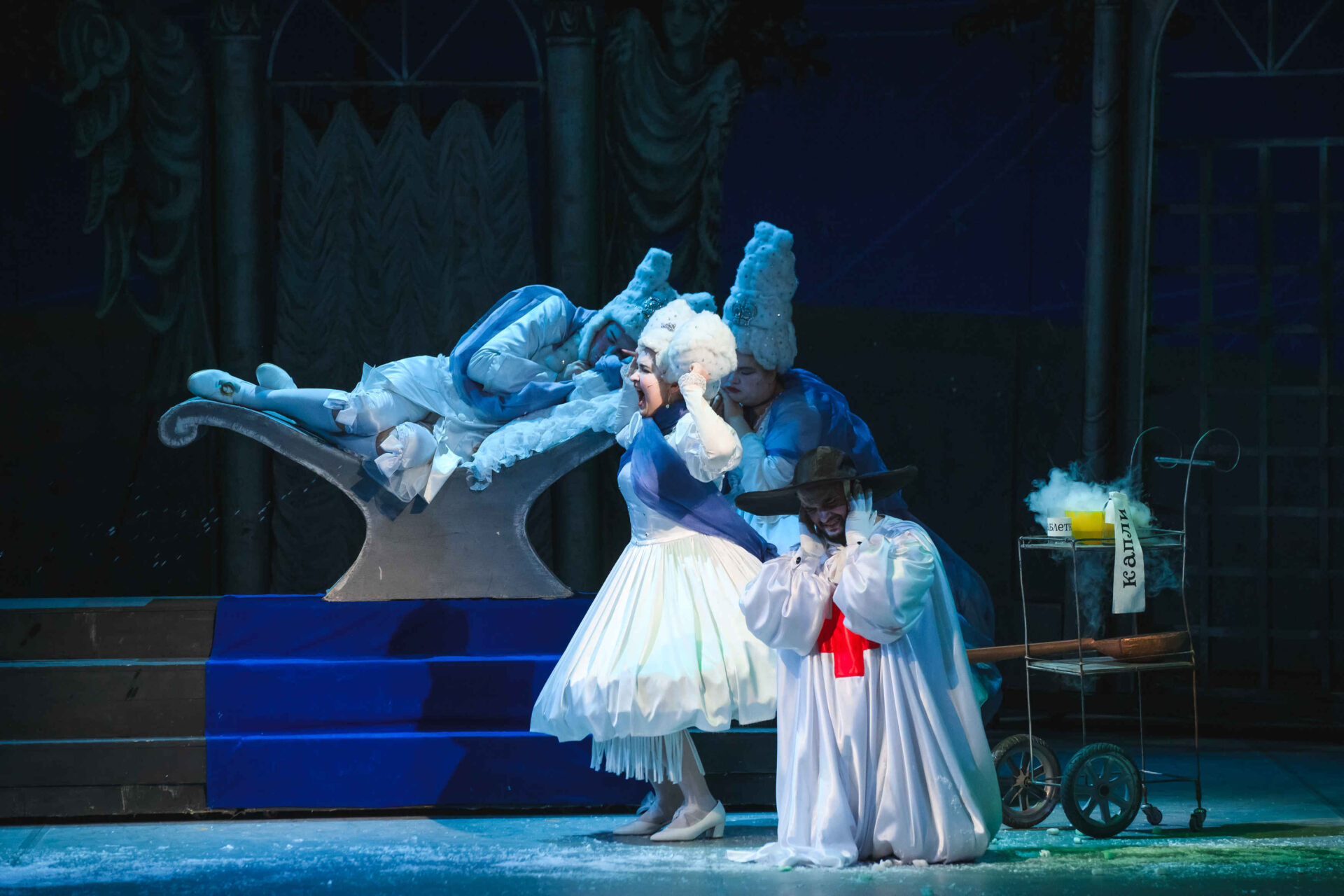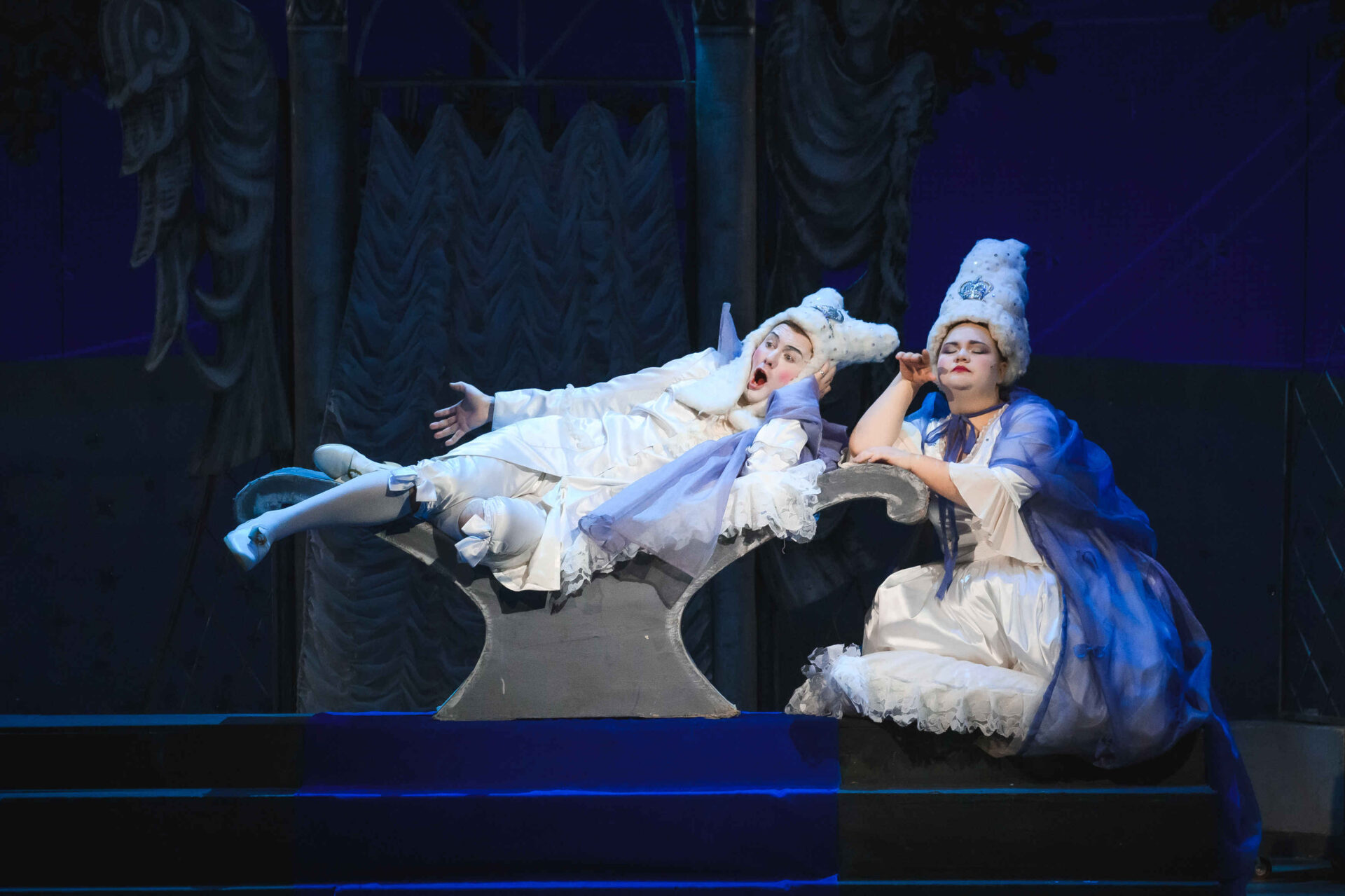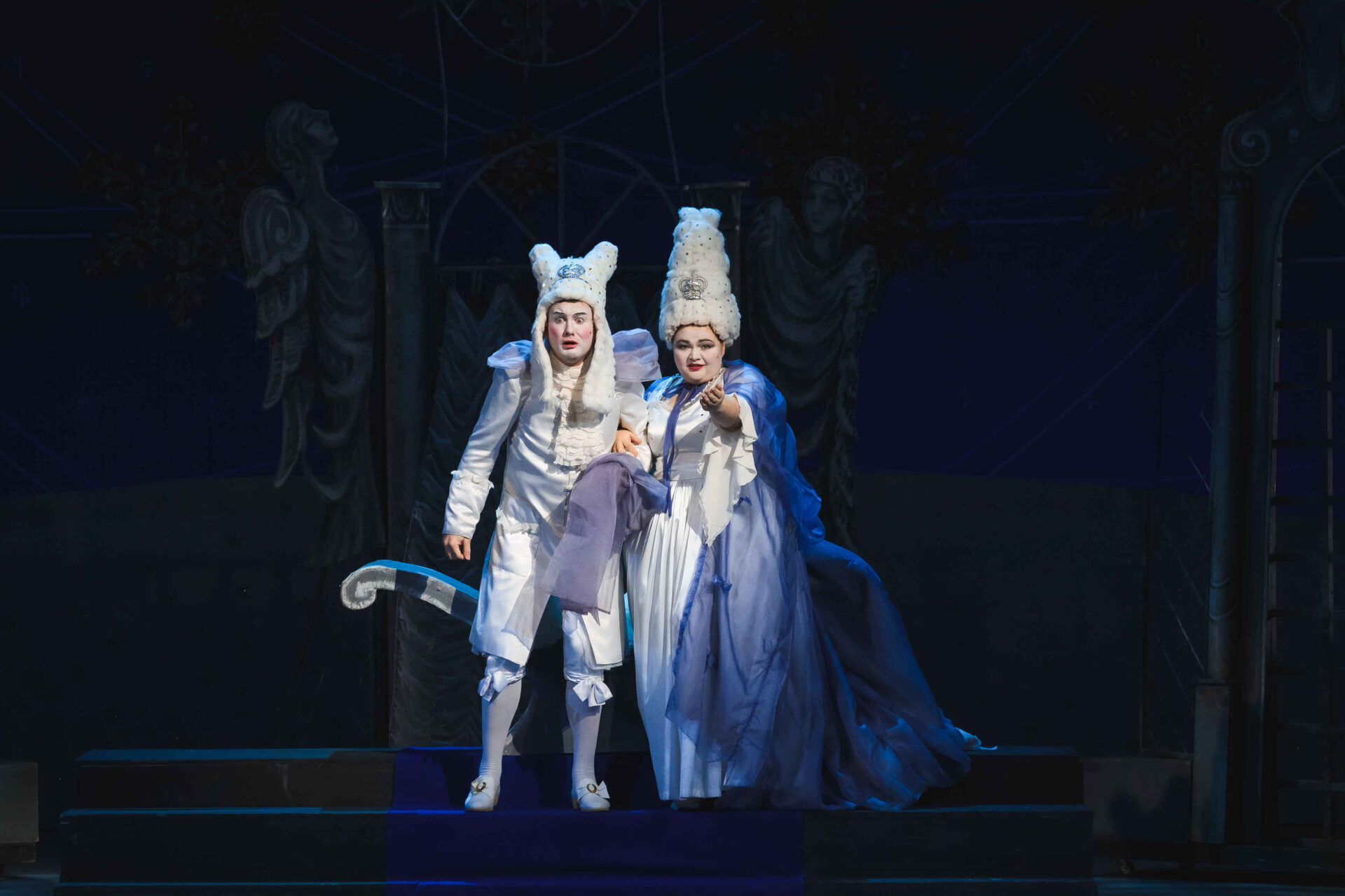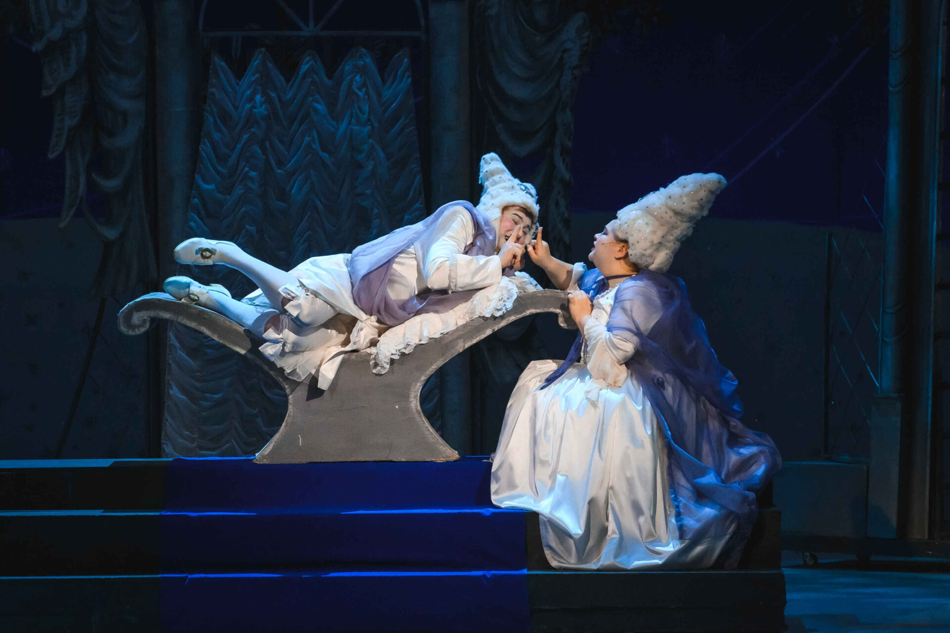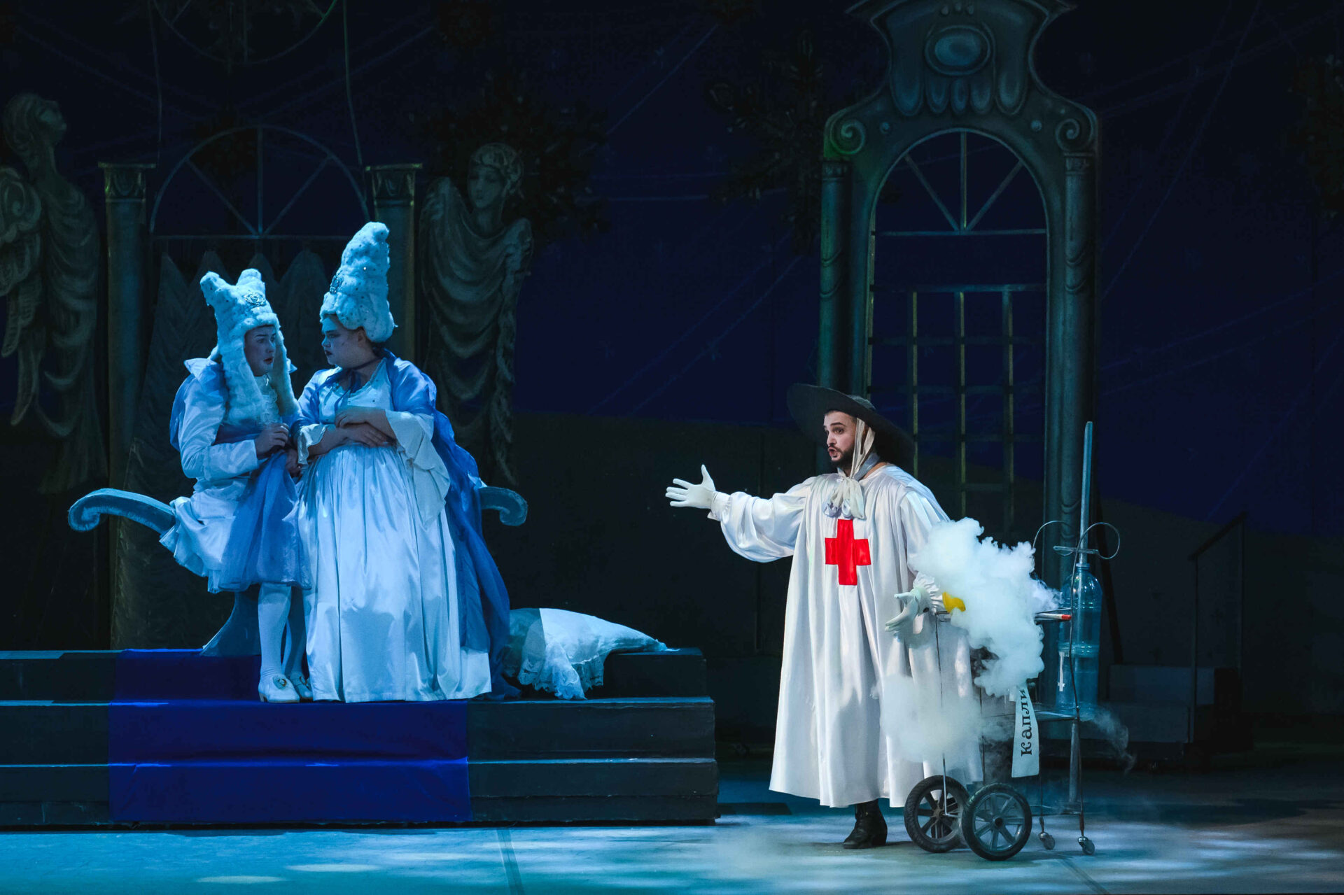 Затем пришла пора познакомиться с оперными голосами. Артист, что поет низким голосом, — это бас. В спектакле он играет Короля. Дама с густым голосом — меццо-сопрано — и это, конечно, Королева. Бархатистый мужской голос — баритон. Его обладатель выступит в роли Доктора Шприца. Девушка, голос которой напоминает одновременно журчание ручейка и соловьиные трели, — колоратурное сопрано. Она — Принцесса. Еще не забудем о теноре — это мужской голос, высокий и лирический. В нашем спектакле он принадлежит Сыщику.