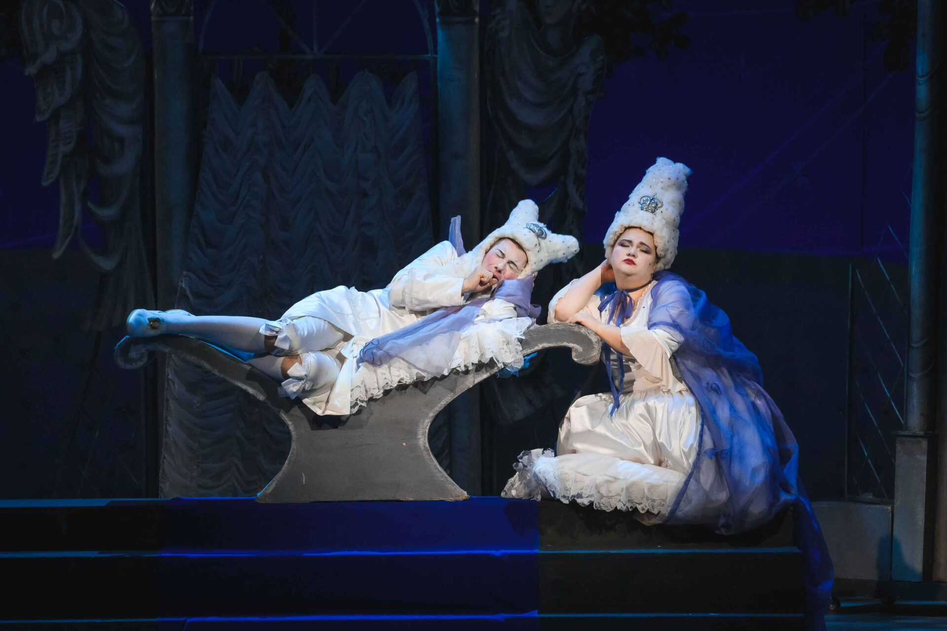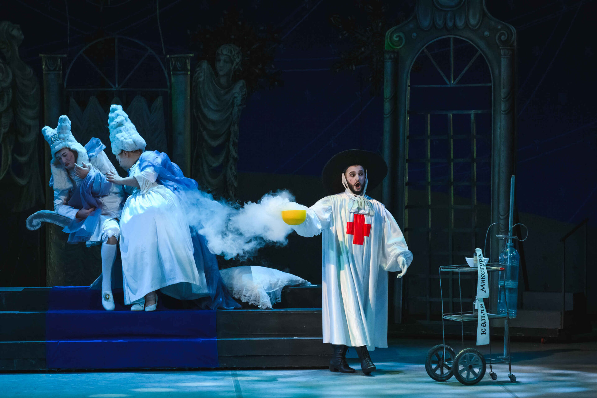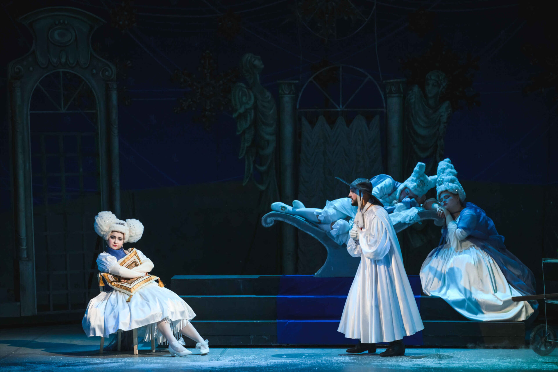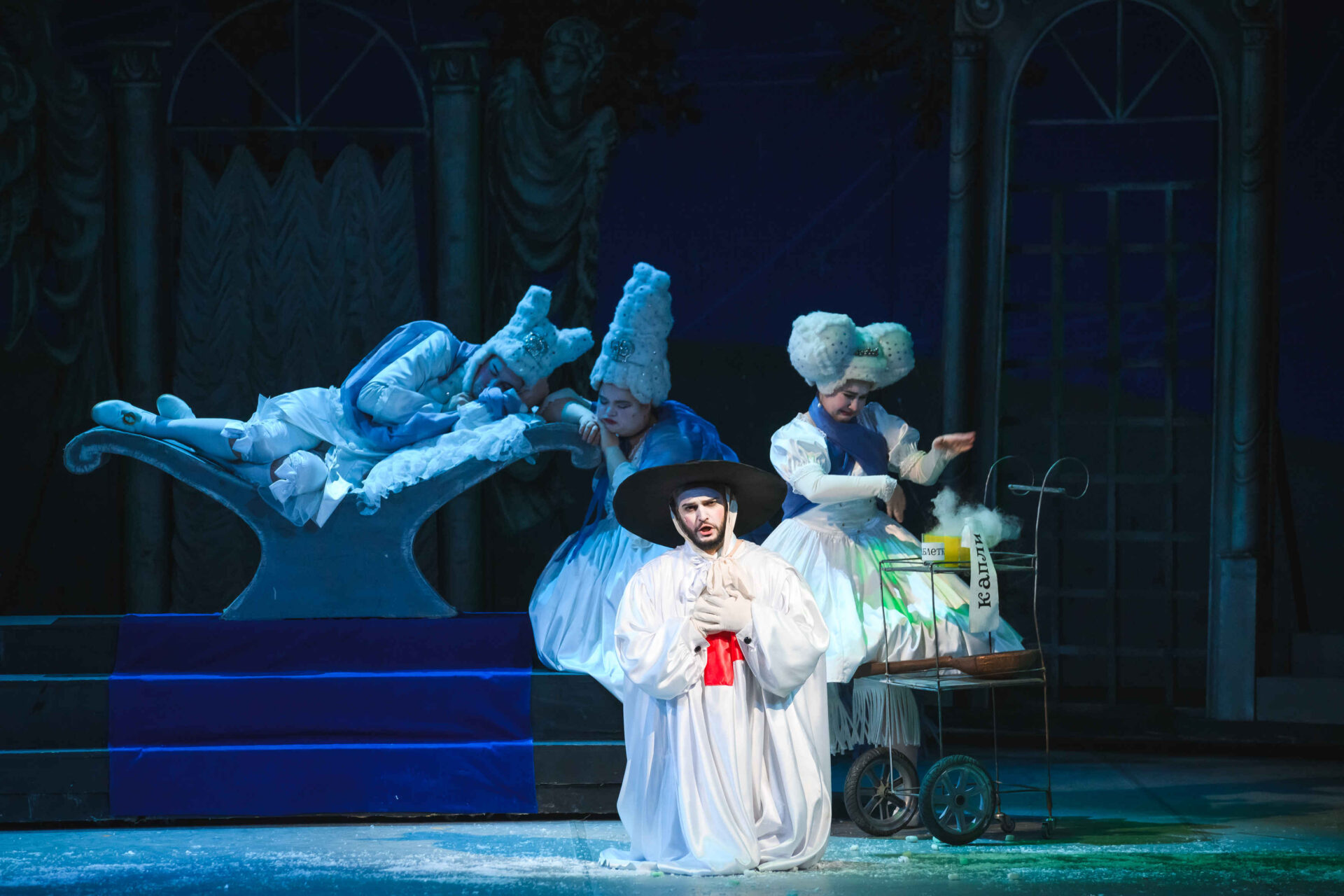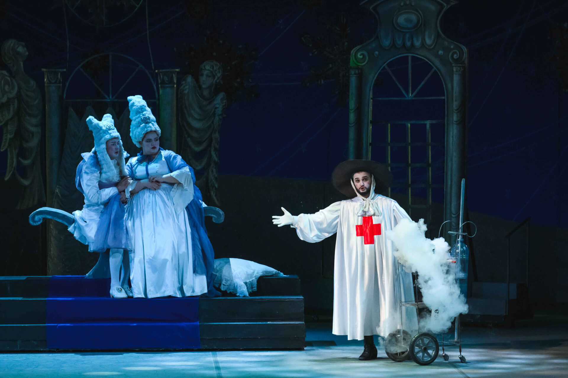 Затем пришла пора познакомиться с оперными голосами. Артист, что поет низким голосом, — это бас. В спектакле он играет Короля. Дама с густым голосом — меццо-сопрано — и это, конечно, Королева. Бархатистый мужской голос — баритон. Его обладатель выступит в роли Доктора Шприца. Девушка, голос которой напоминает одновременно журчание ручейка и соловьиные трели, — колоратурное сопрано. Она — Принцесса. Еще не забудем о теноре — это мужской голос, высокий и лирический. В нашем спектакле он принадлежит Сыщику.