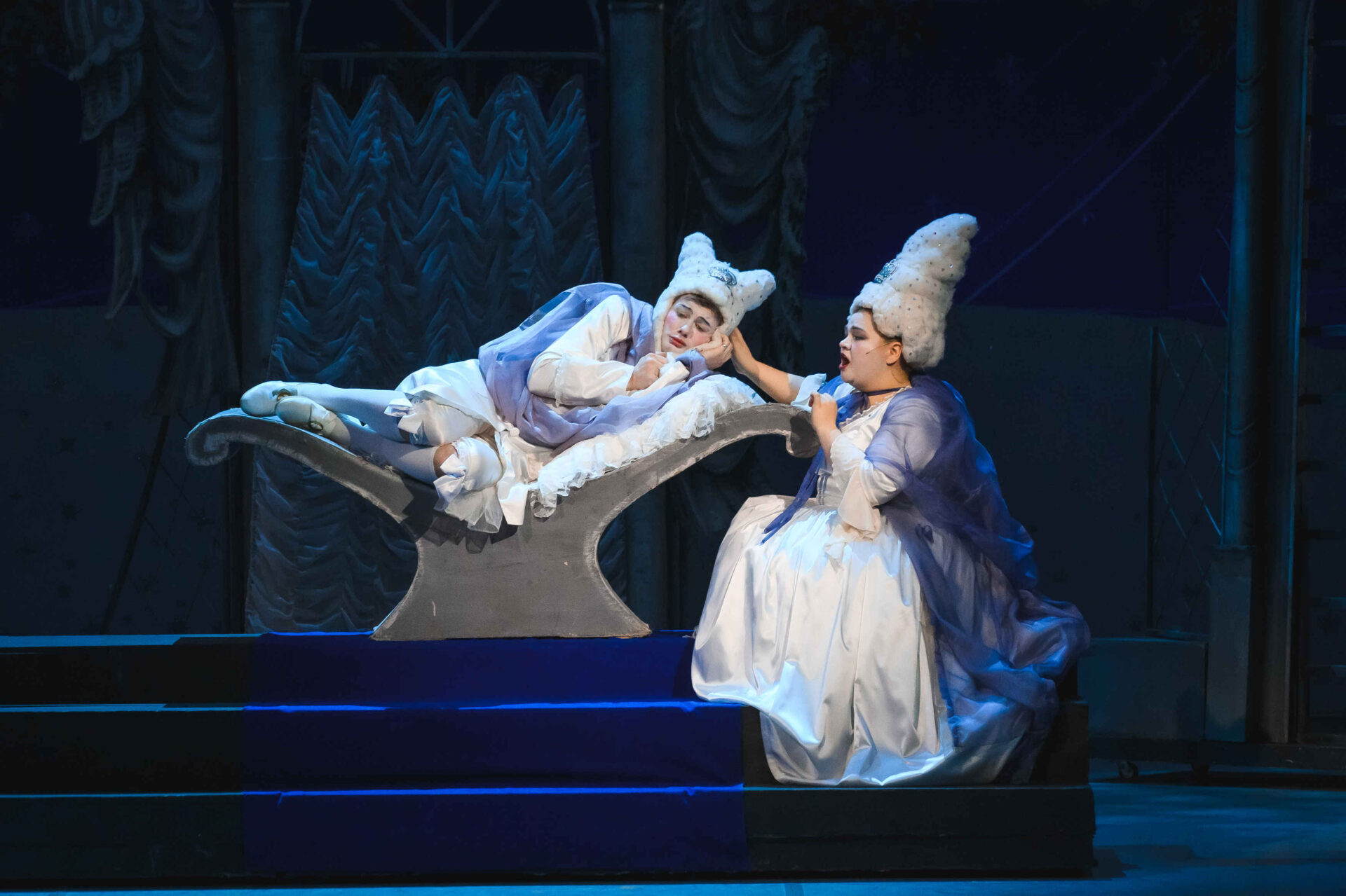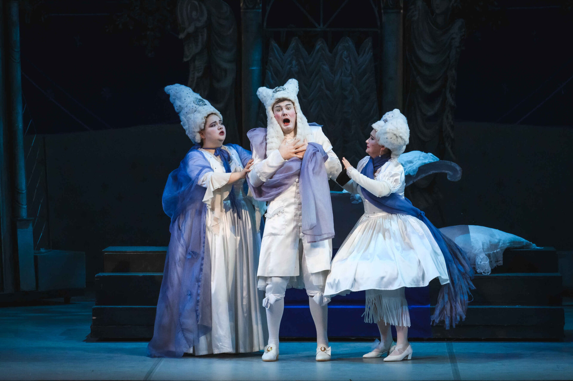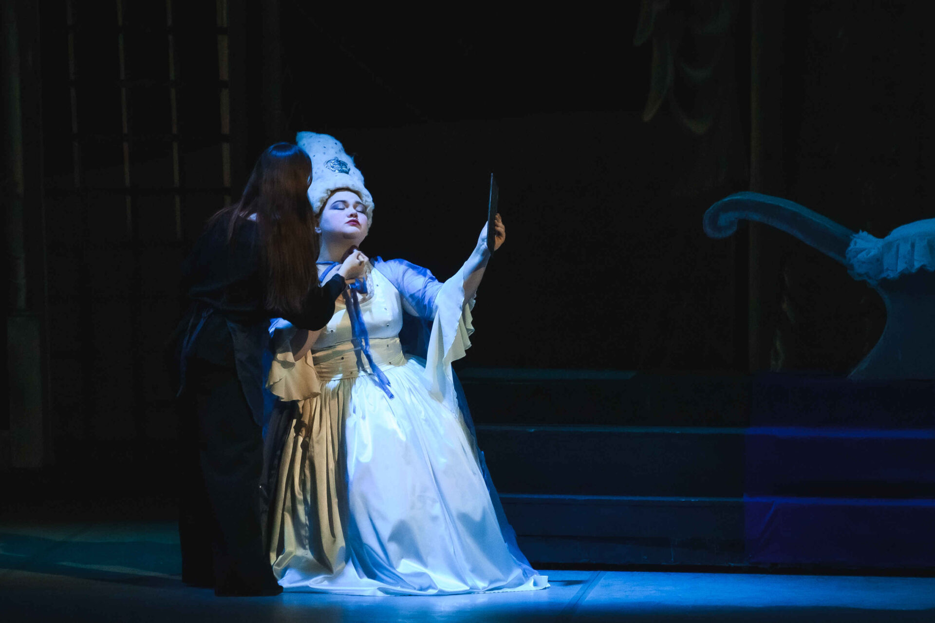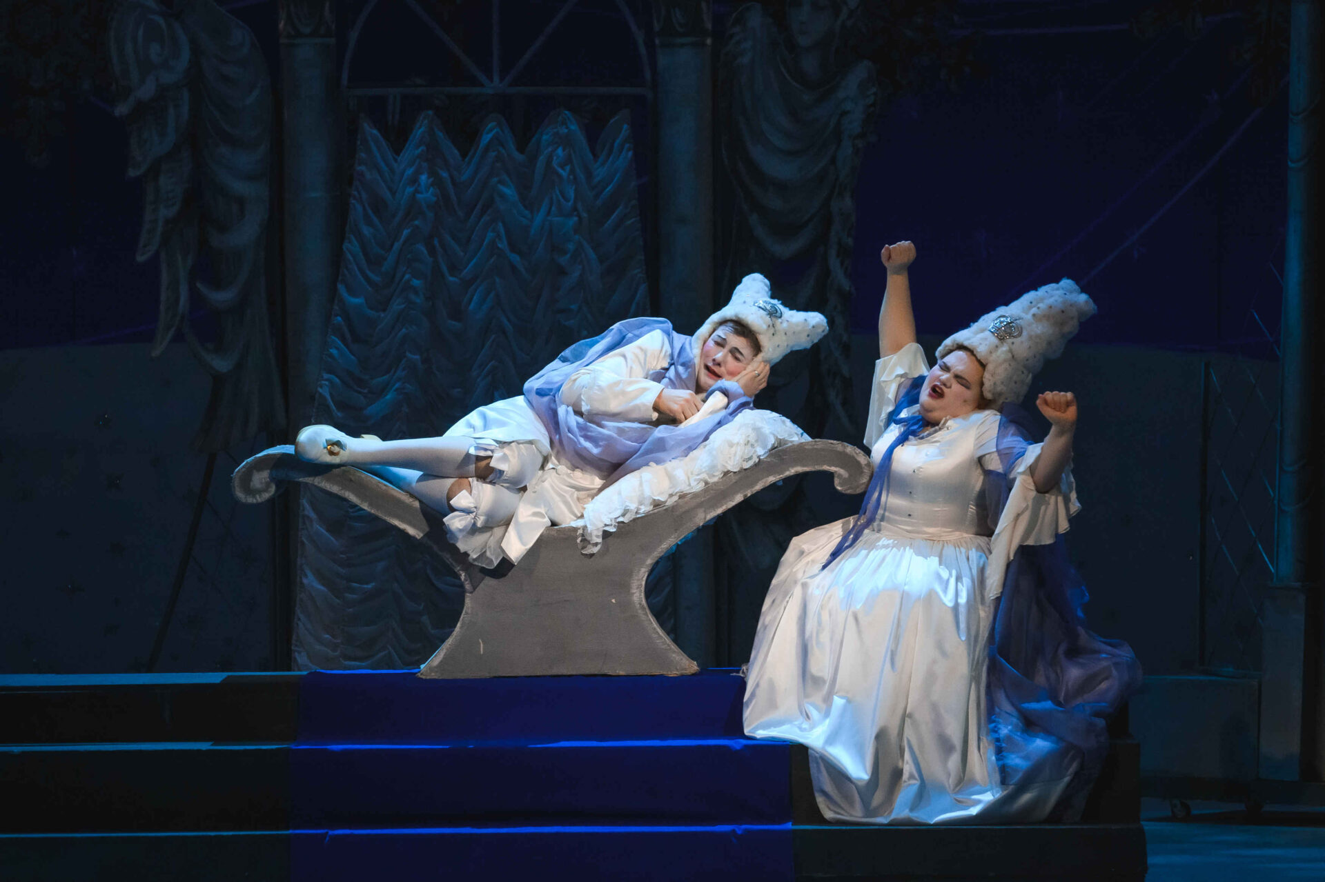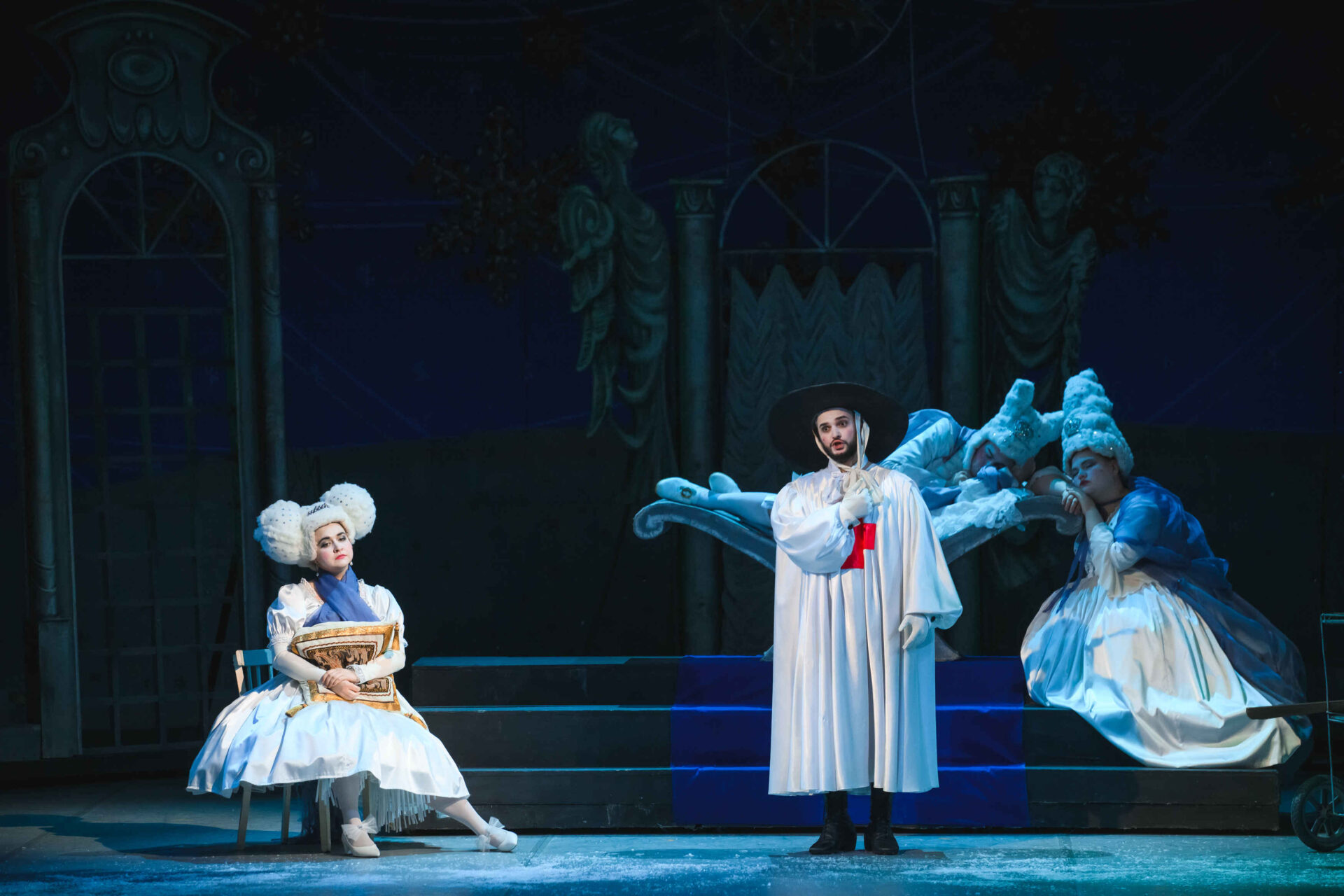 Затем пришла пора познакомиться с оперными голосами. Артист, что поет низким голосом, — это бас. В спектакле он играет Короля. Дама с густым голосом — меццо-сопрано — и это, конечно, Королева. Бархатистый мужской голос — баритон. Его обладатель выступит в роли Доктора Шприца. Девушка, голос которой напоминает одновременно журчание ручейка и соловьиные трели, — колоратурное сопрано. Она — Принцесса. Еще не забудем о теноре — это мужской голос, высокий и лирический. В нашем спектакле он принадлежит Сыщику.