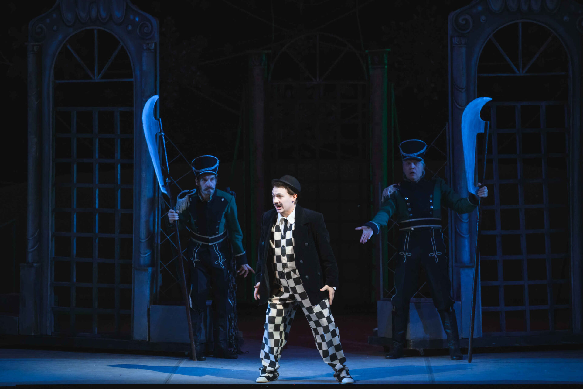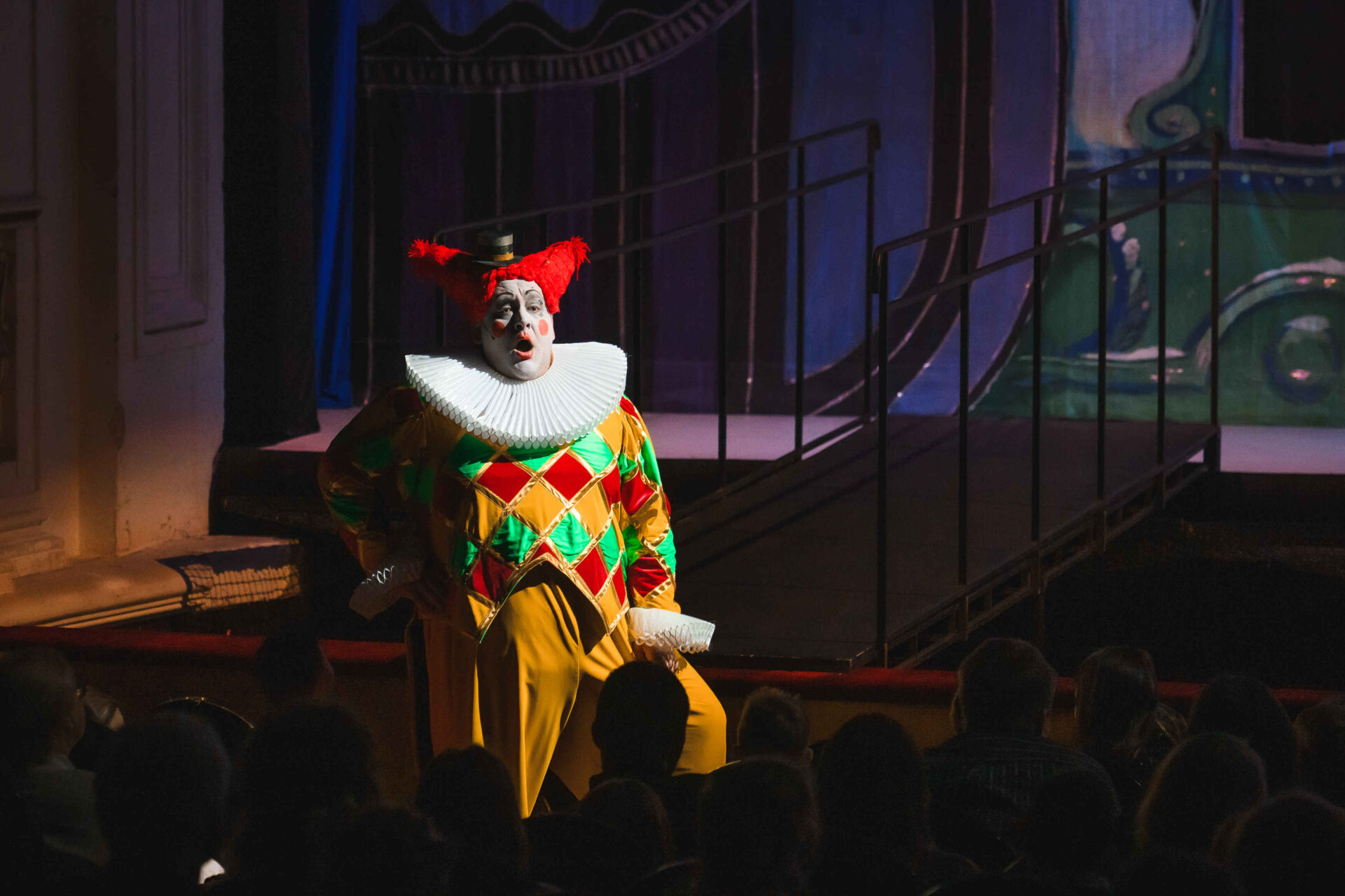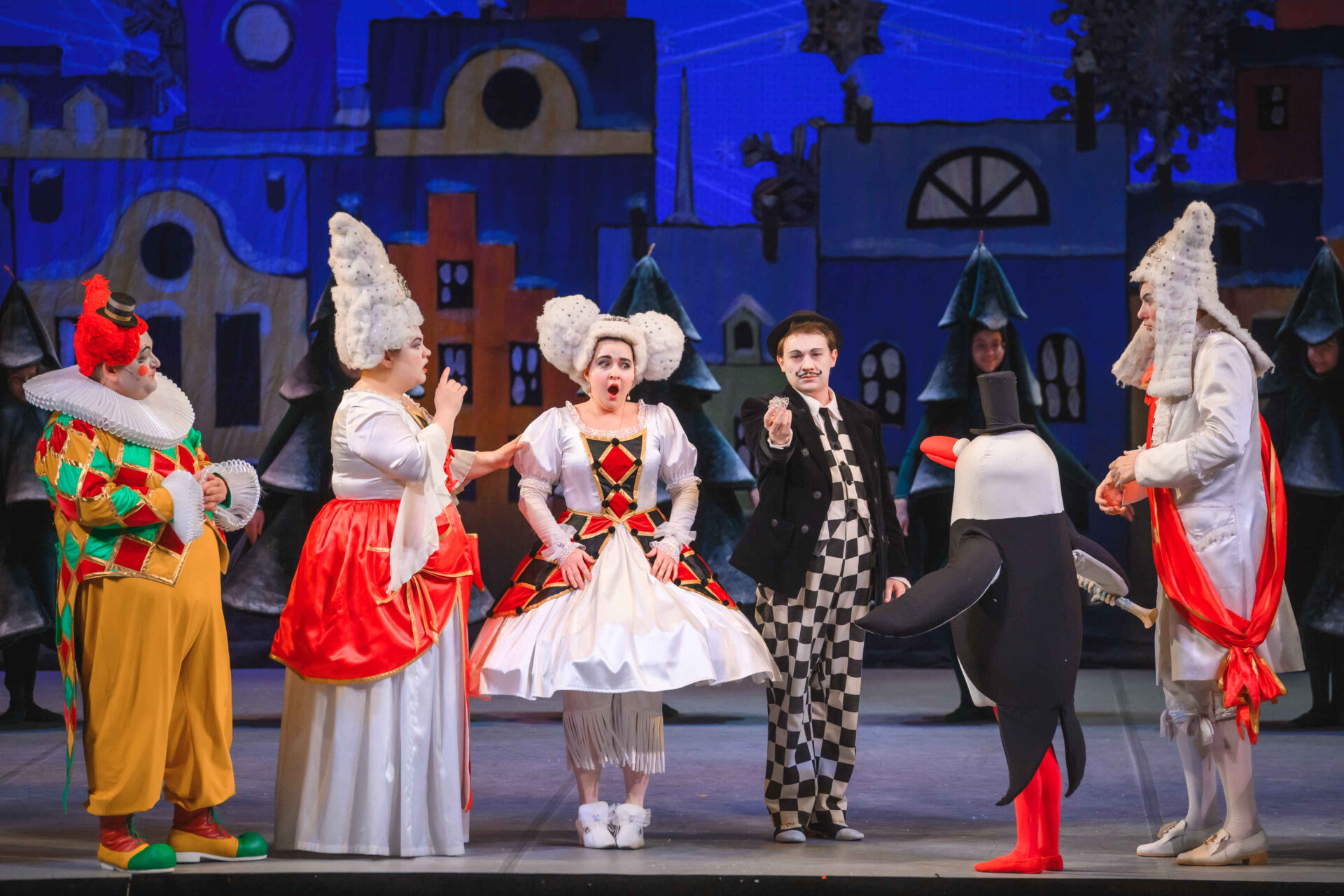 Забавный, смешной, познавательный спектакль помогает юным зрителям познакомиться с музыкальным театром. Все главные персонажи спектакля — одушевленные компоненты музыкального театра: Инструменты и Голоса, Хор и Оркестр. Зрители поют и играют вместе с клоунами — Грустным и Веселым. Вместе с Сыщиком отправляются на поиски украденного из дворца Короля II и королевы Зевуньи XIII Голубого Бриллианта, из‑за пропажи которого Принцесса Слезабета льет горькие слезы. А в финале попадают на бал, где каждый музыкальный инструмент после часа приключений в Оперной стране уже воспринимается как старый добрый знакомый. Спектакль построен на представлении детской аудитории всеми любимых и узнаваемых театральных персонажей, а также на шуточном цитировании известных сцен из музыкальных спектаклей. Например, танец маленьких лебедей исполняют Дрессированные Пингвины.