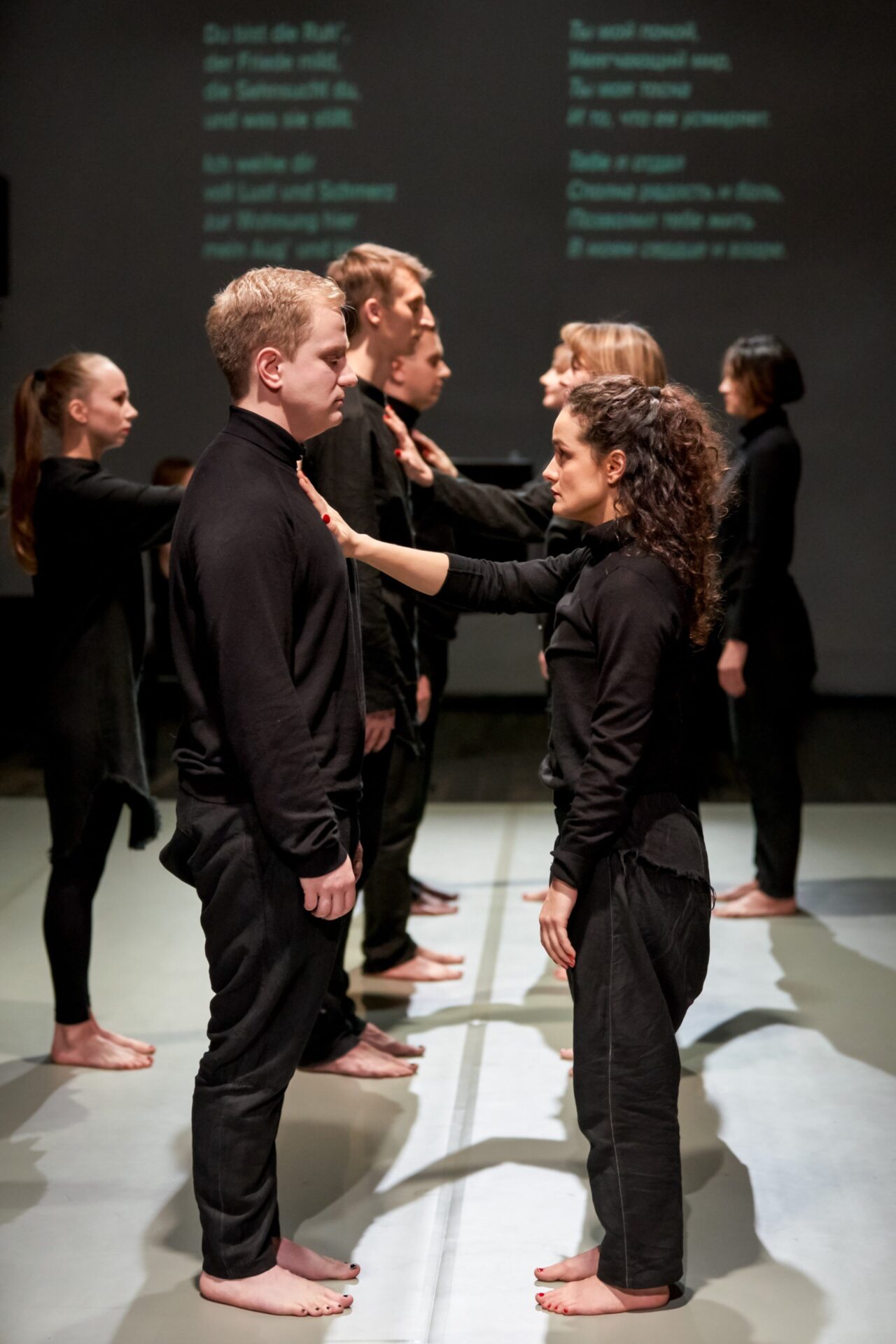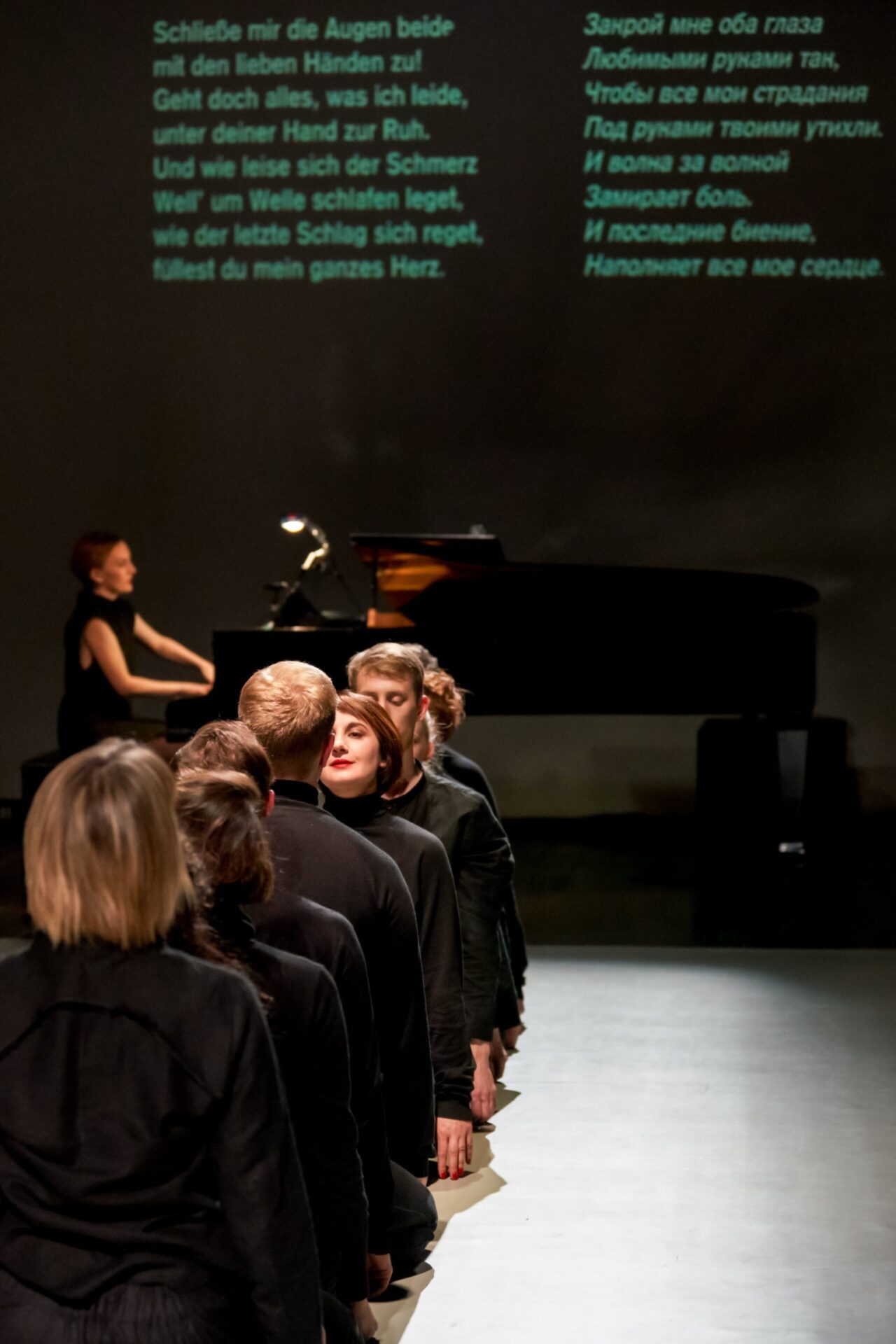 — Этот спектакль музыкально представляет собой традиционный Liederabend — «венок песен», нанизанный на определенную драматургическую нить. Но одновременно это и перформанс, в котором нет никакой разницы между перформерами с «движенческим» опытом и академическими певцами. Нет никаких предубеждений в отношении оперных певцов, которые якобы не могут обрести пластической свободы на сцене, поскольку пение сковывает их и лишает мобильности.