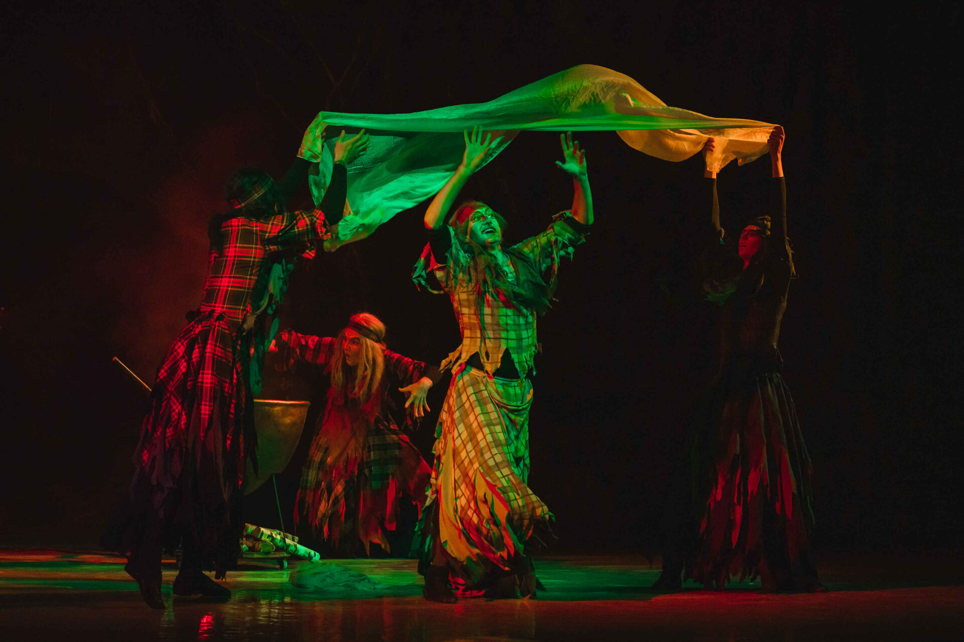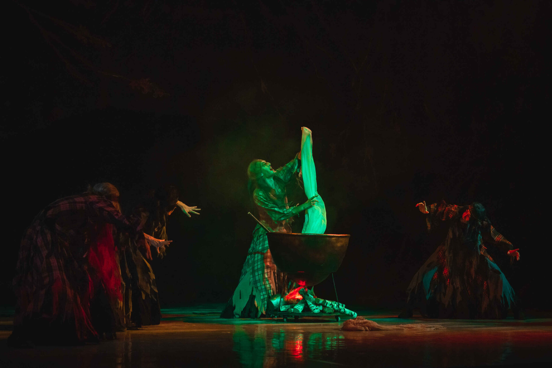 Колдунья ворожит, склонившись над кипящим котлом, у нее в руках длинный прозрачный шарф.