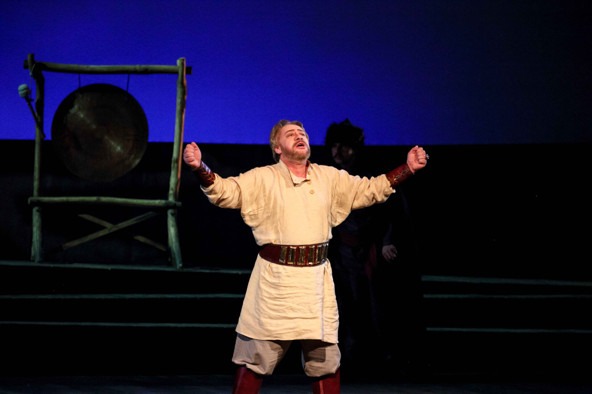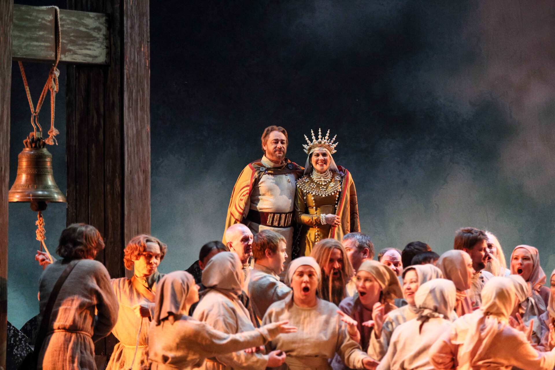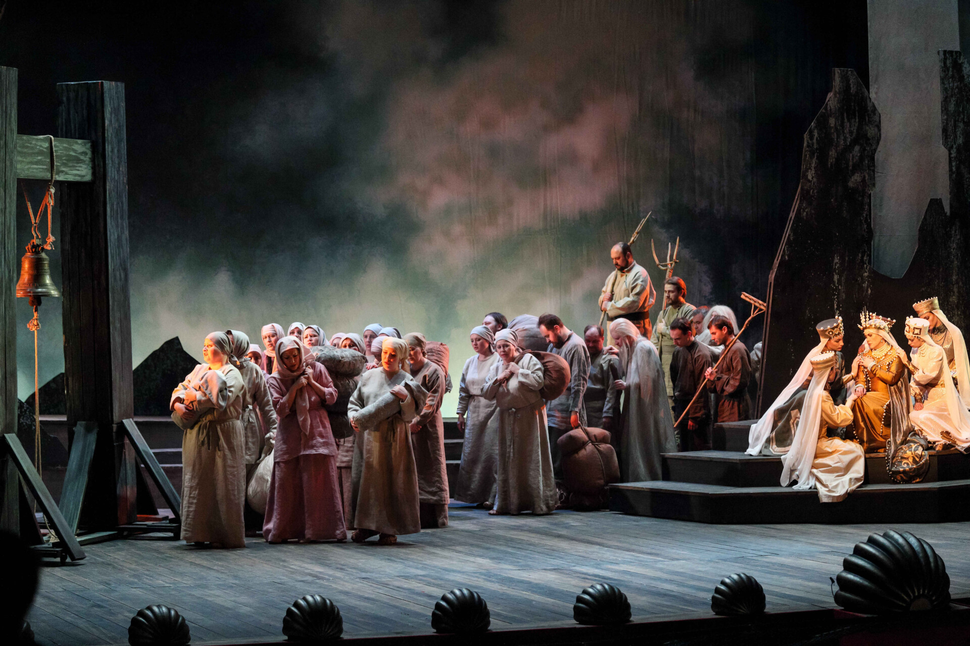 Звучит набатный колокол. В окнах терема виднеется зарево пожара. Бояре готовятся к обороне.
