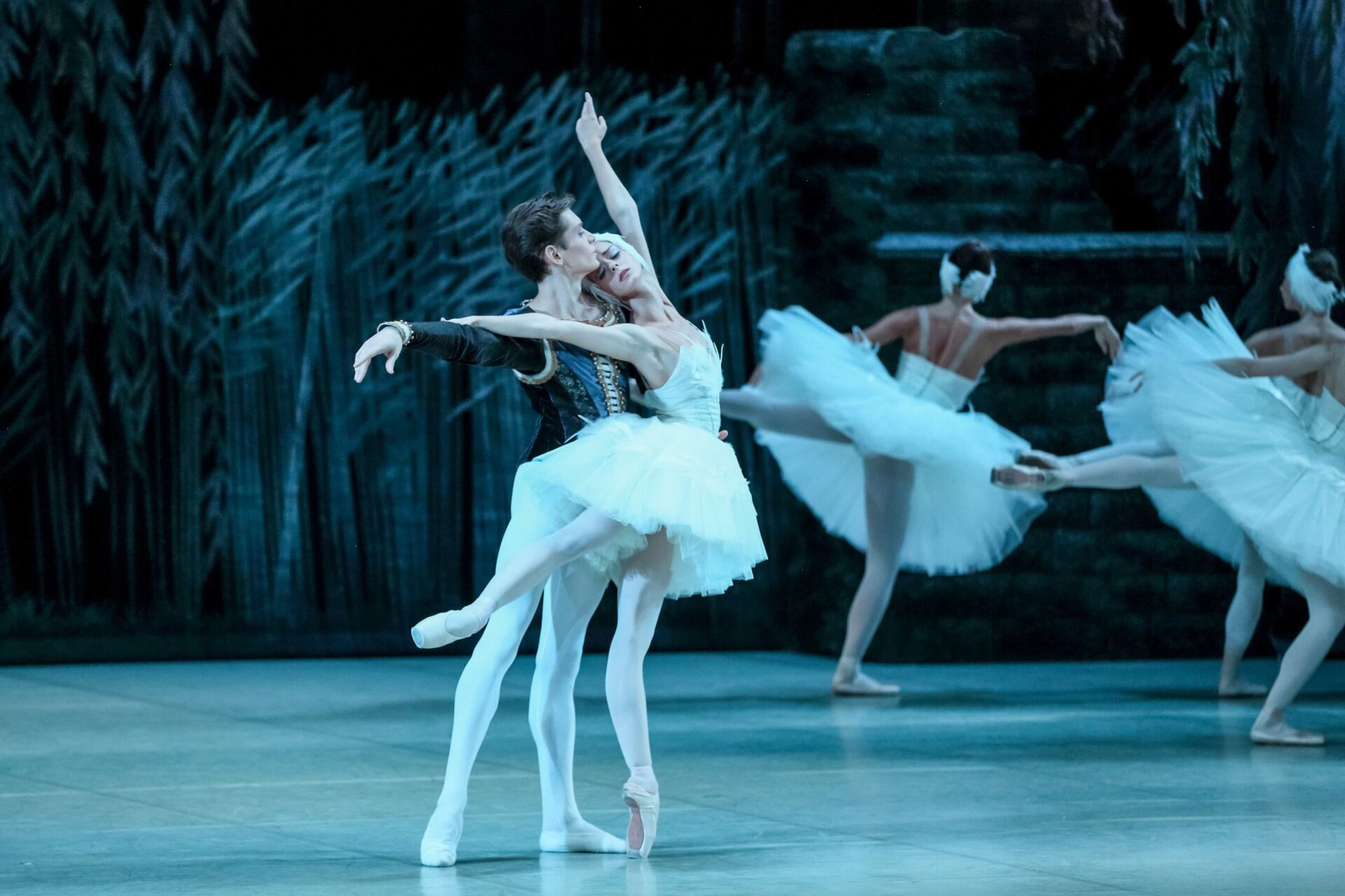 В это время по озеру проплывает стая лебедей, вслед за стаей — лебедь в короне. Зигфрид вскидывает арбалет, чтобы выстрелить, как вдруг из развалин часовни появляется девушка. Это королева лебедей Одетта. Принц поражен этим превращением.
