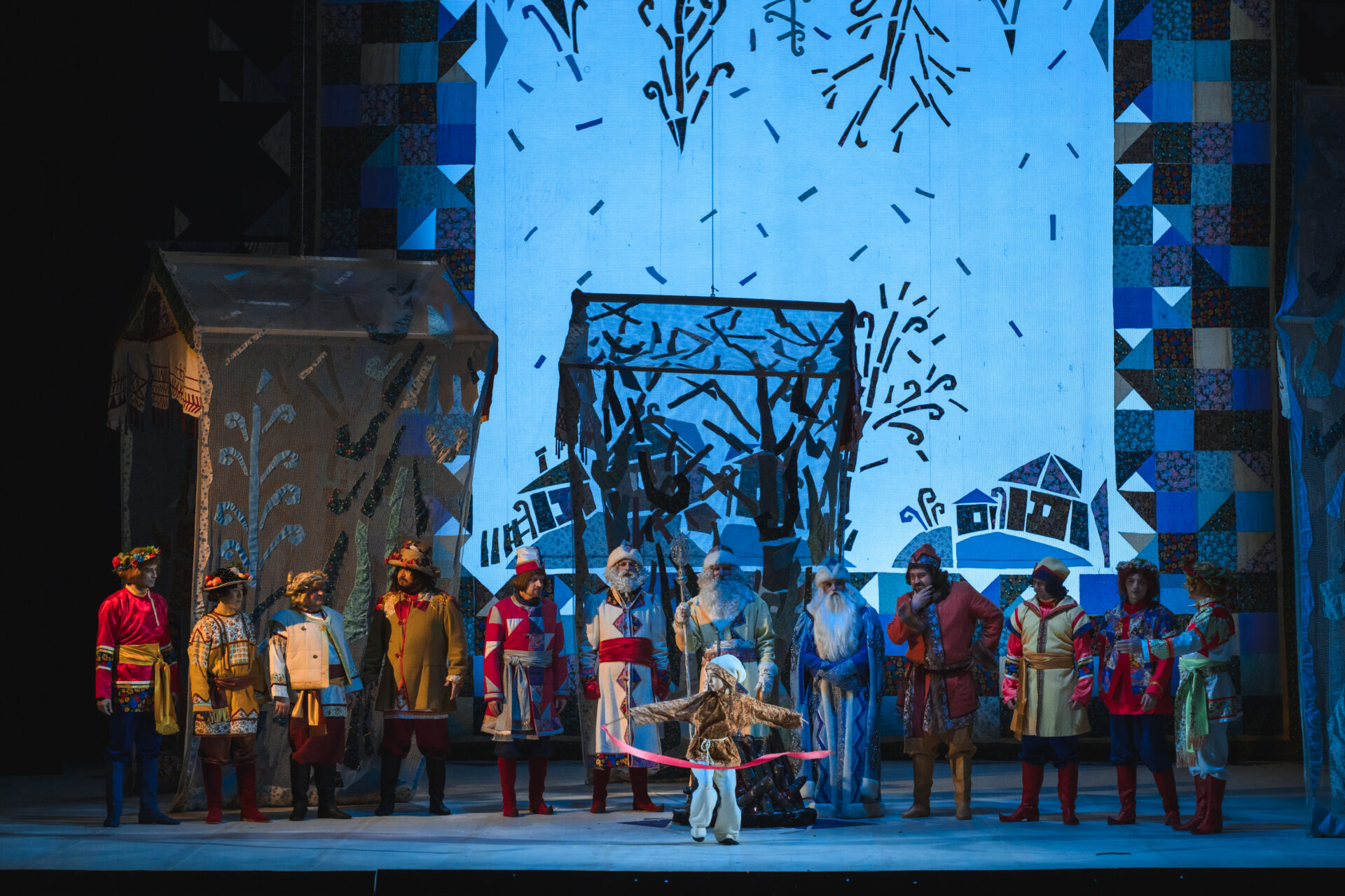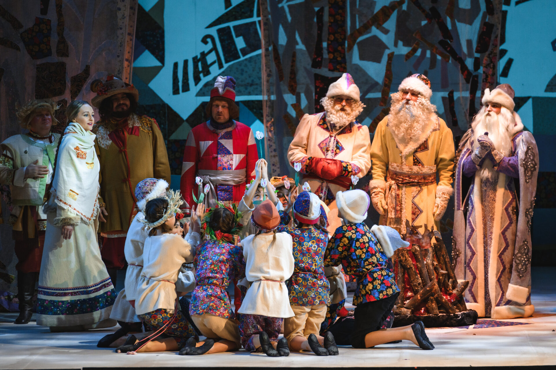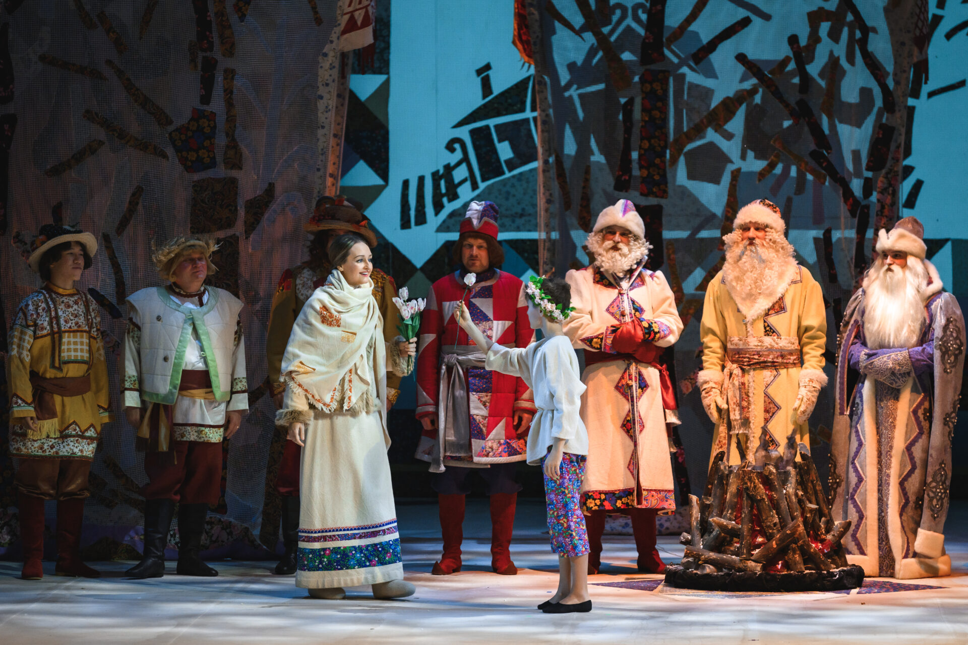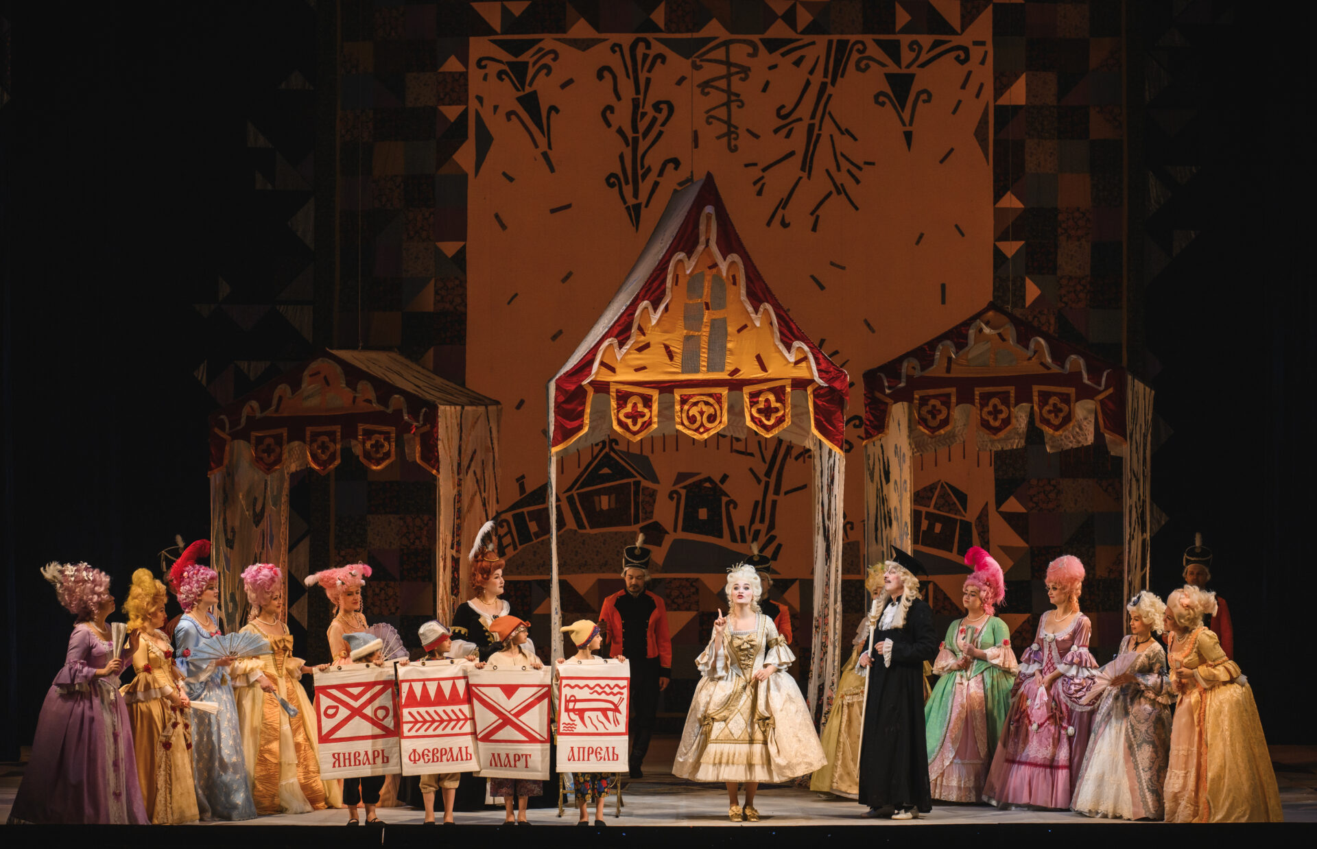«Ах так! — выходит из себя Королева. — Тогда я брошу колечко в озеро». Сказала — сделала. Только успела Падчерица произнести: «Ты катись, катись, колечко…» — как налетела вьюга. Сквозь шум метели слышен бубен Января, рог Февраля, мартовские бубенчики. Разбегаются придворные кто куда. Остаются только Королева, Гофмейстерина, Канцлер, Профессор да Мачеха с Дочкой. Все, приникнув к земле, замирают. Метель утихает. Становится светло, солнечно. Все поднимают головы и с удивлением смотрят вокруг. Перед ними стоят двенадцать месяцев.