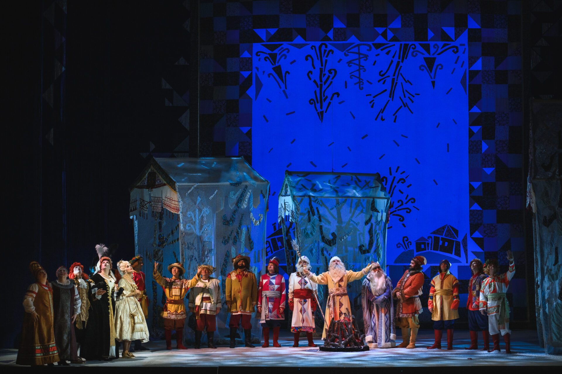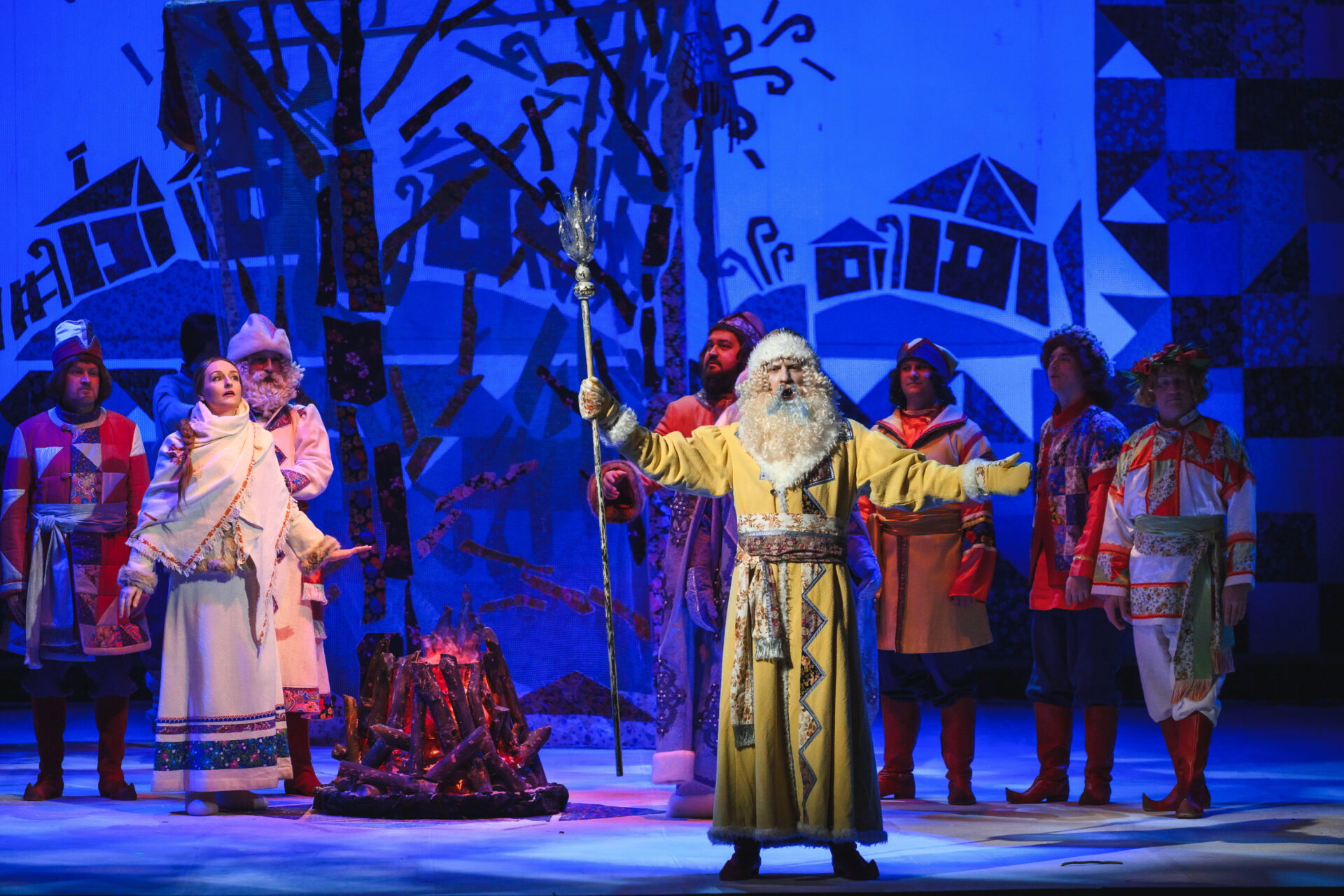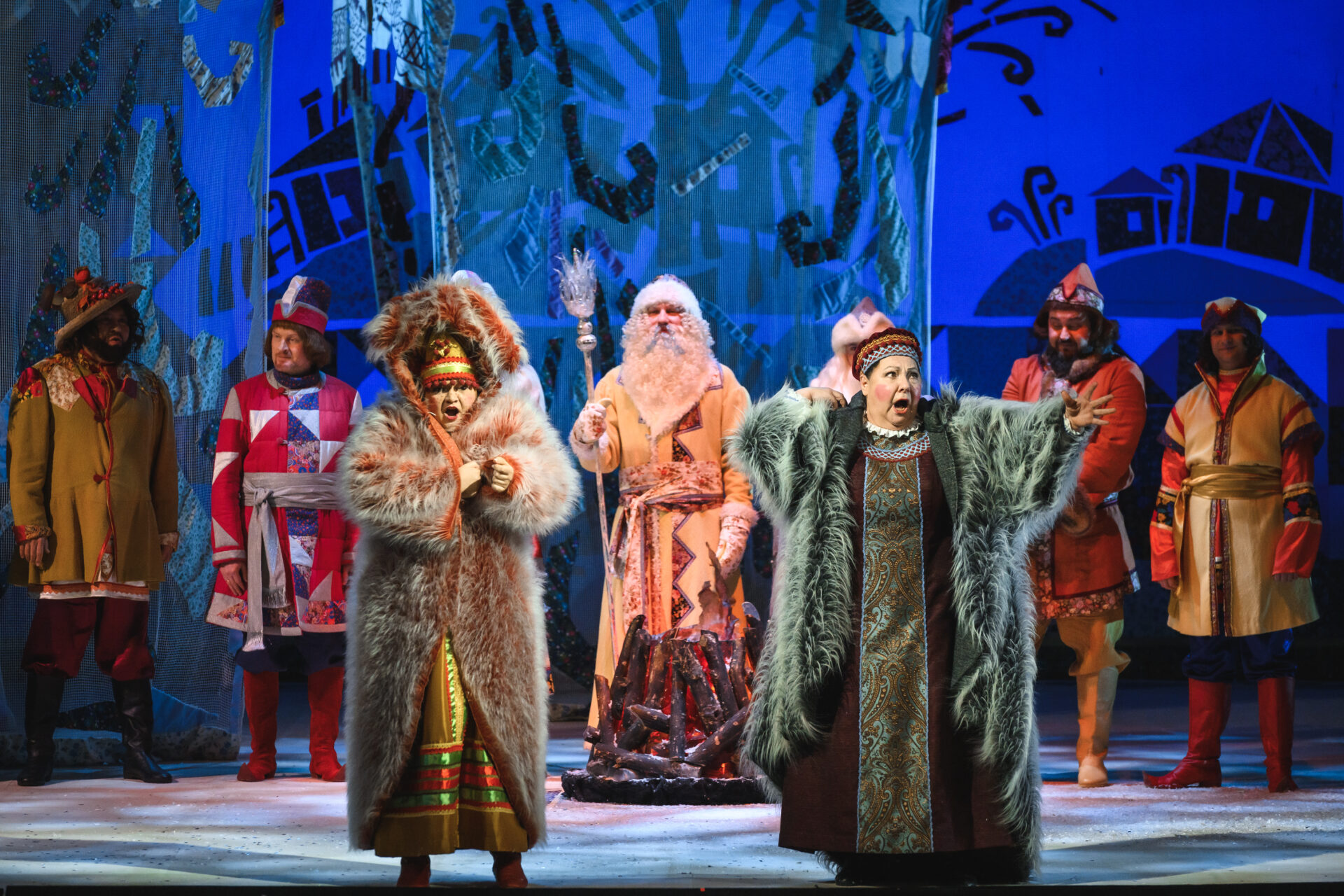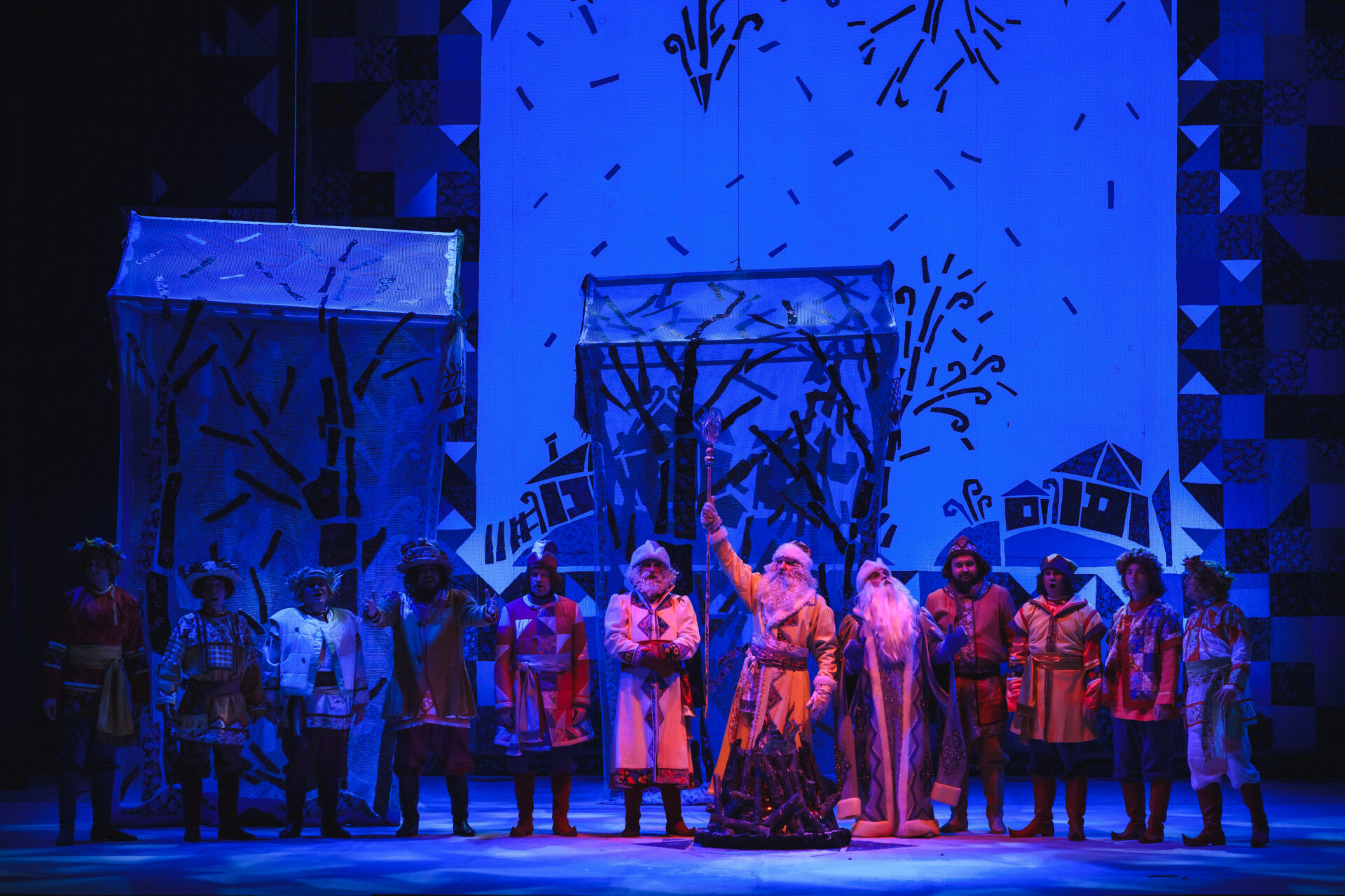 «Ах так! — выходит из себя Королева. — Тогда я брошу колечко в озеро». Сказала — сделала. Только успела Падчерица произнести: «Ты катись, катись, колечко…» — как налетела вьюга. Сквозь шум метели слышен бубен Января, рог Февраля, мартовские бубенчики. Разбегаются придворные кто куда. Остаются только Королева, Гофмейстерина, Канцлер, Профессор да Мачеха с Дочкой. Все, приникнув к земле, замирают. Метель утихает. Становится светло, солнечно. Все поднимают головы и с удивлением смотрят вокруг. Перед ними стоят двенадцать месяцев.